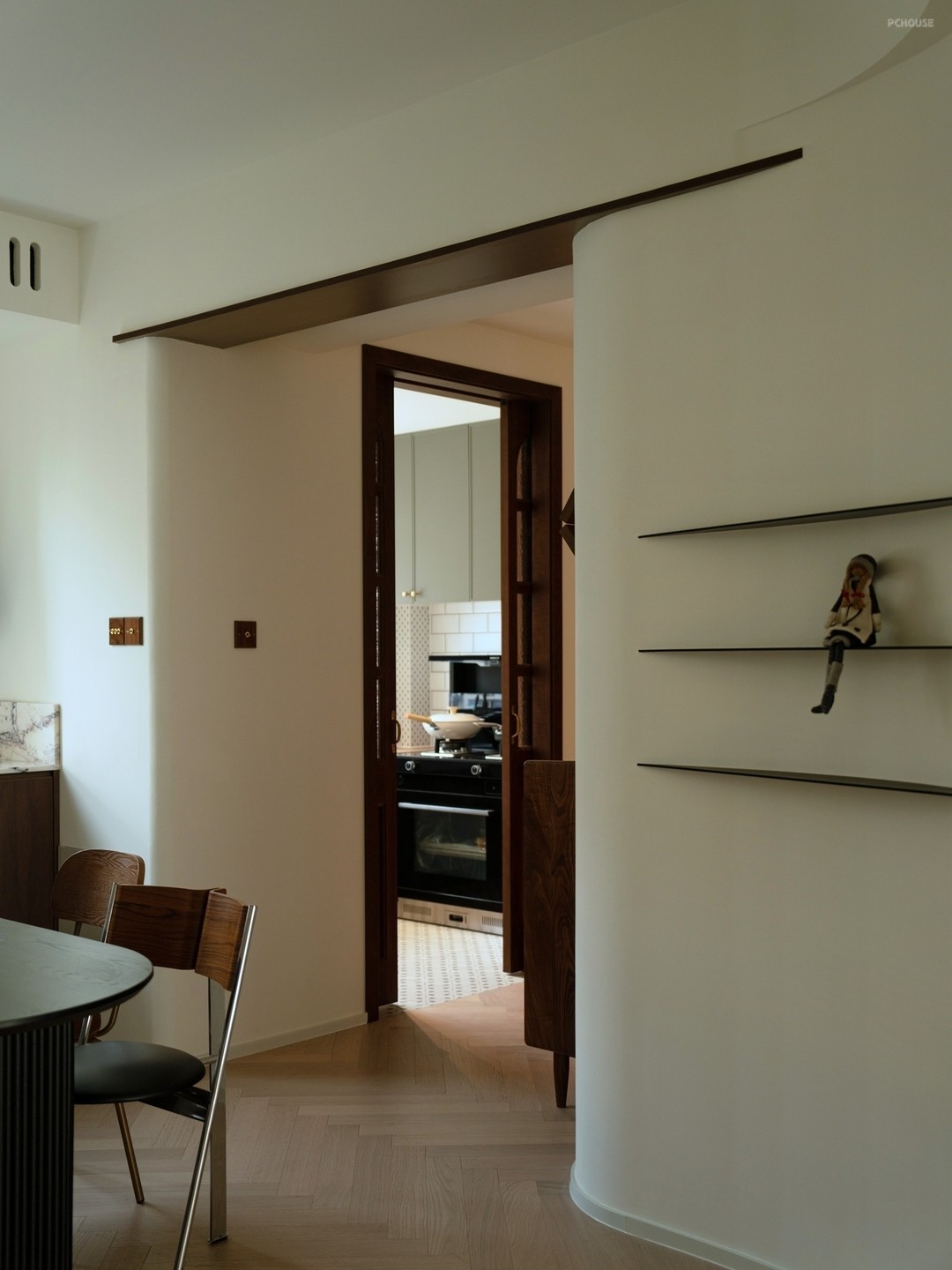 入戶右手邊便是廚房,嵌入式夾墻門節(jié)省空間,又能夠保證門的開合,從而提高門廳空間的自然采光