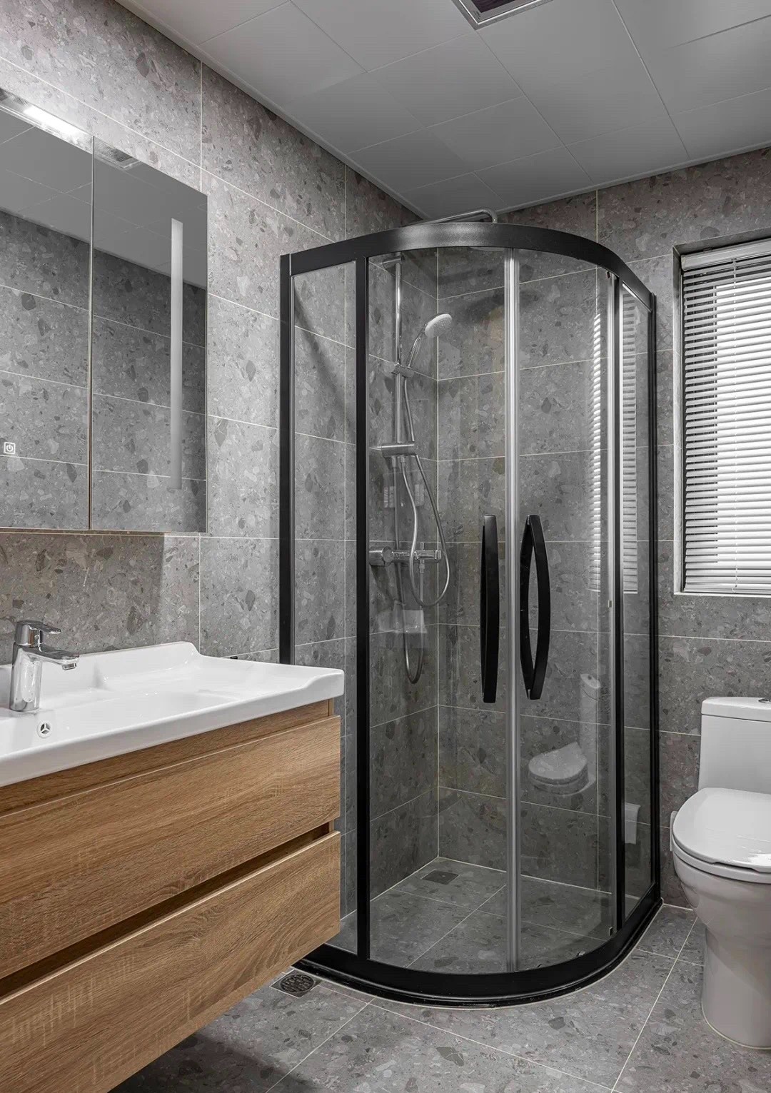 衛(wèi)生間采用墻地一體的樣式,避免過多花色打破簡潔統(tǒng)一的風格定位,干區(qū)與濕區(qū)設置隔斷,只分隔功能不分割空間,創(chuàng)造出視覺上的連接感