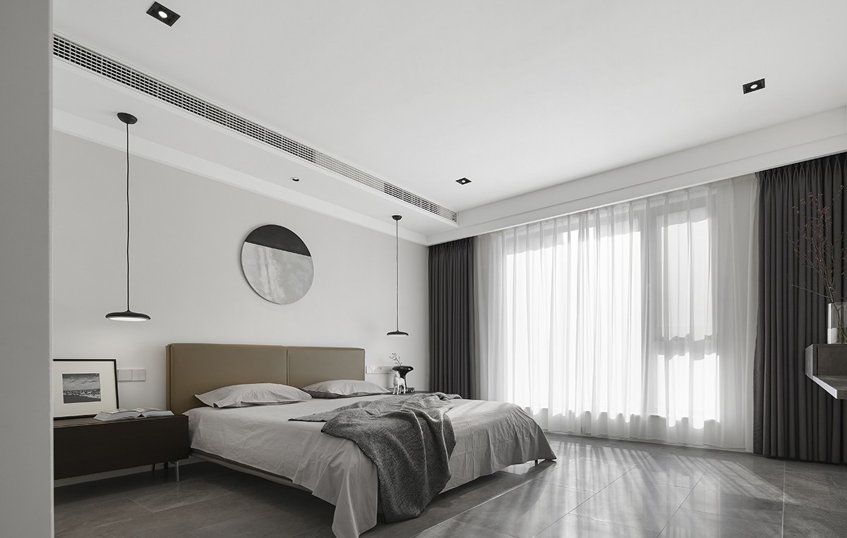 床頭吊燈對稱布置,馬來漆質(zhì)感的圓盤裝置提升了整體品質(zhì)與美感,安寧靜謐的氛圍不期而至。