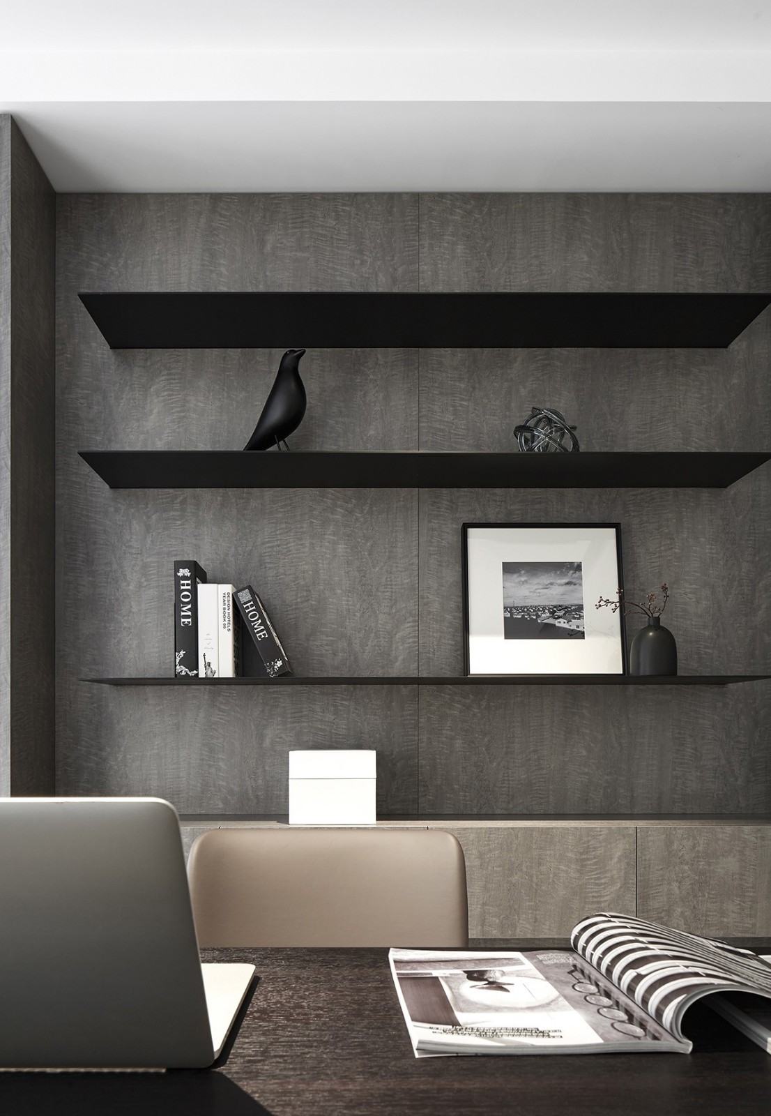 黑色鋼板結(jié)構(gòu)的層板架,代替了傳統(tǒng)的木質(zhì)柜,作為現(xiàn)代風(fēng)格,金屬元素的局部點(diǎn)綴是必不可少的。
