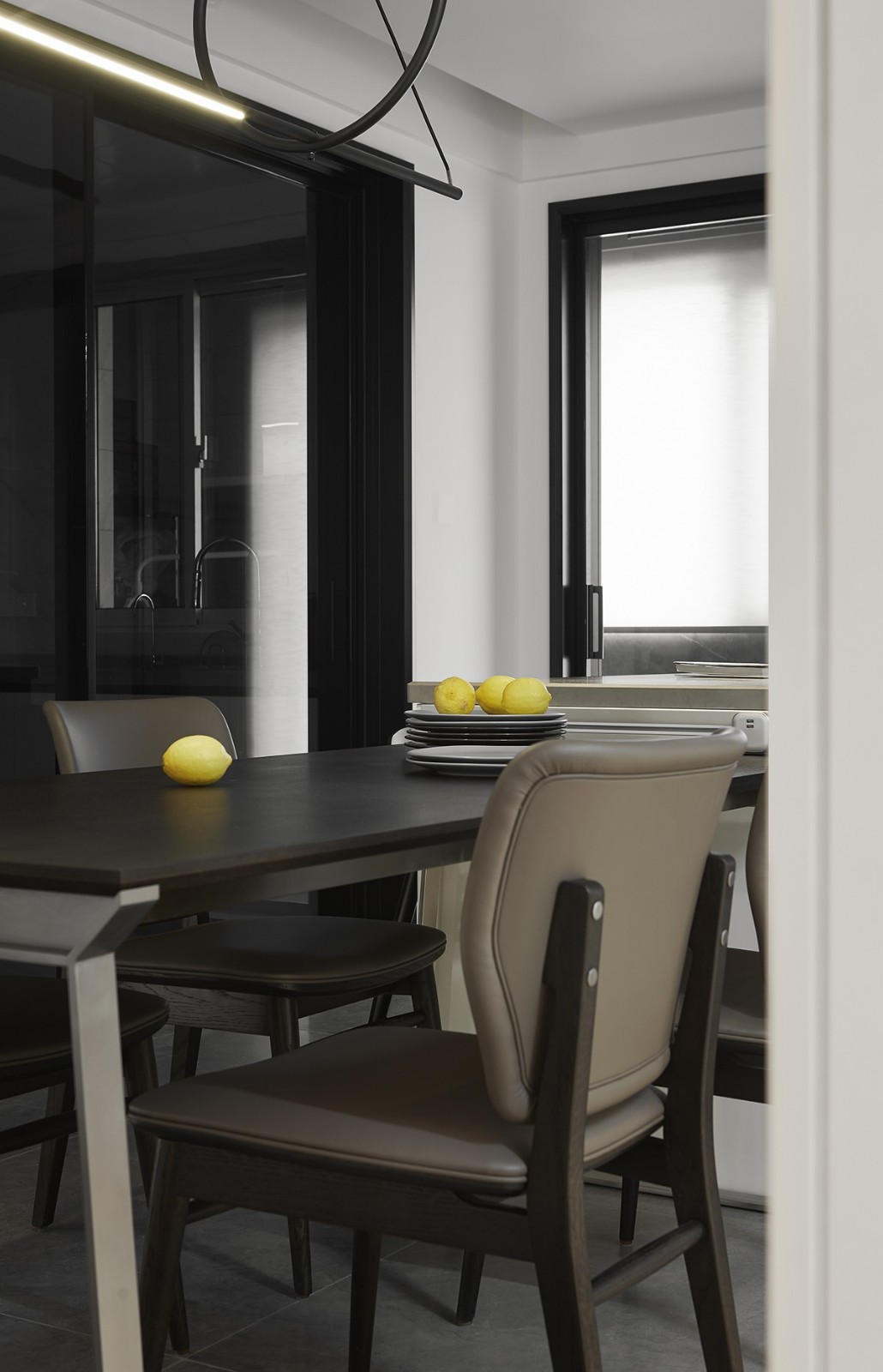 黑色巖板的餐桌,搭配皮質(zhì)餐椅,“***感”自然就凸顯了出來。