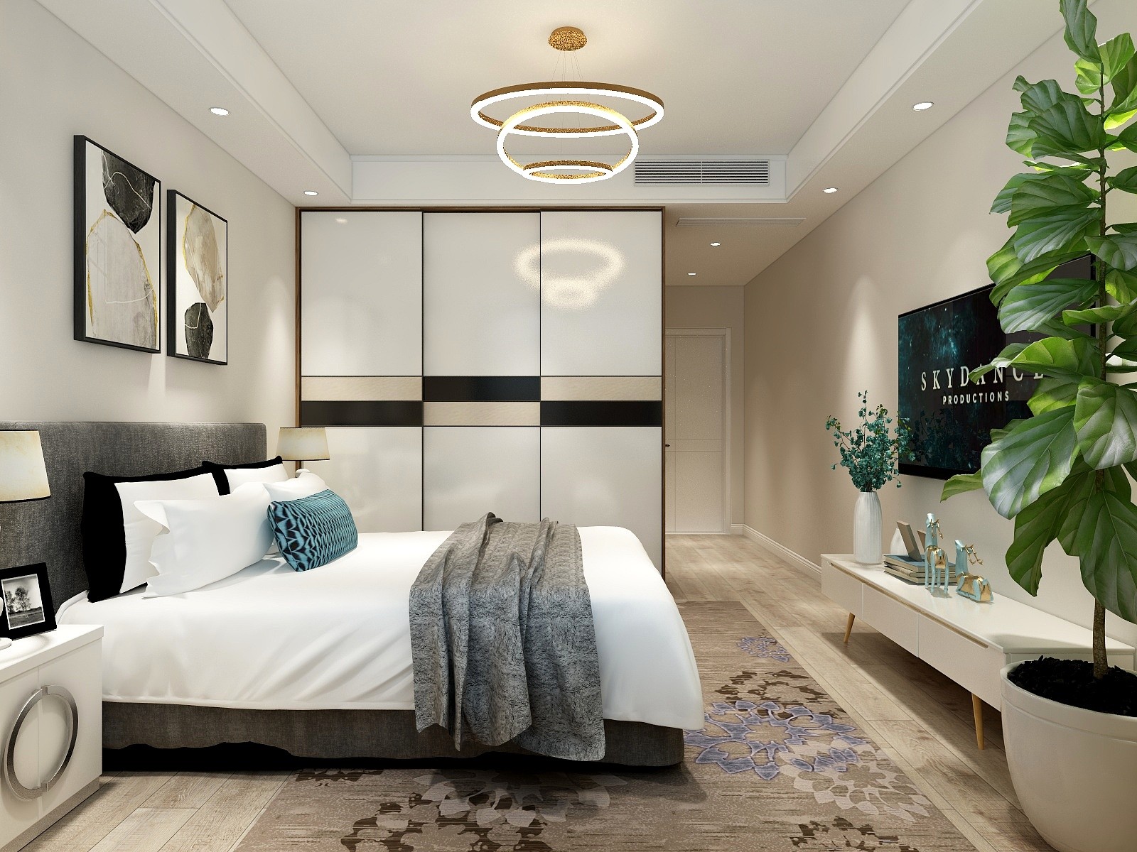 簡潔明快、功能齊全、充滿現(xiàn)代感的主臥室。
