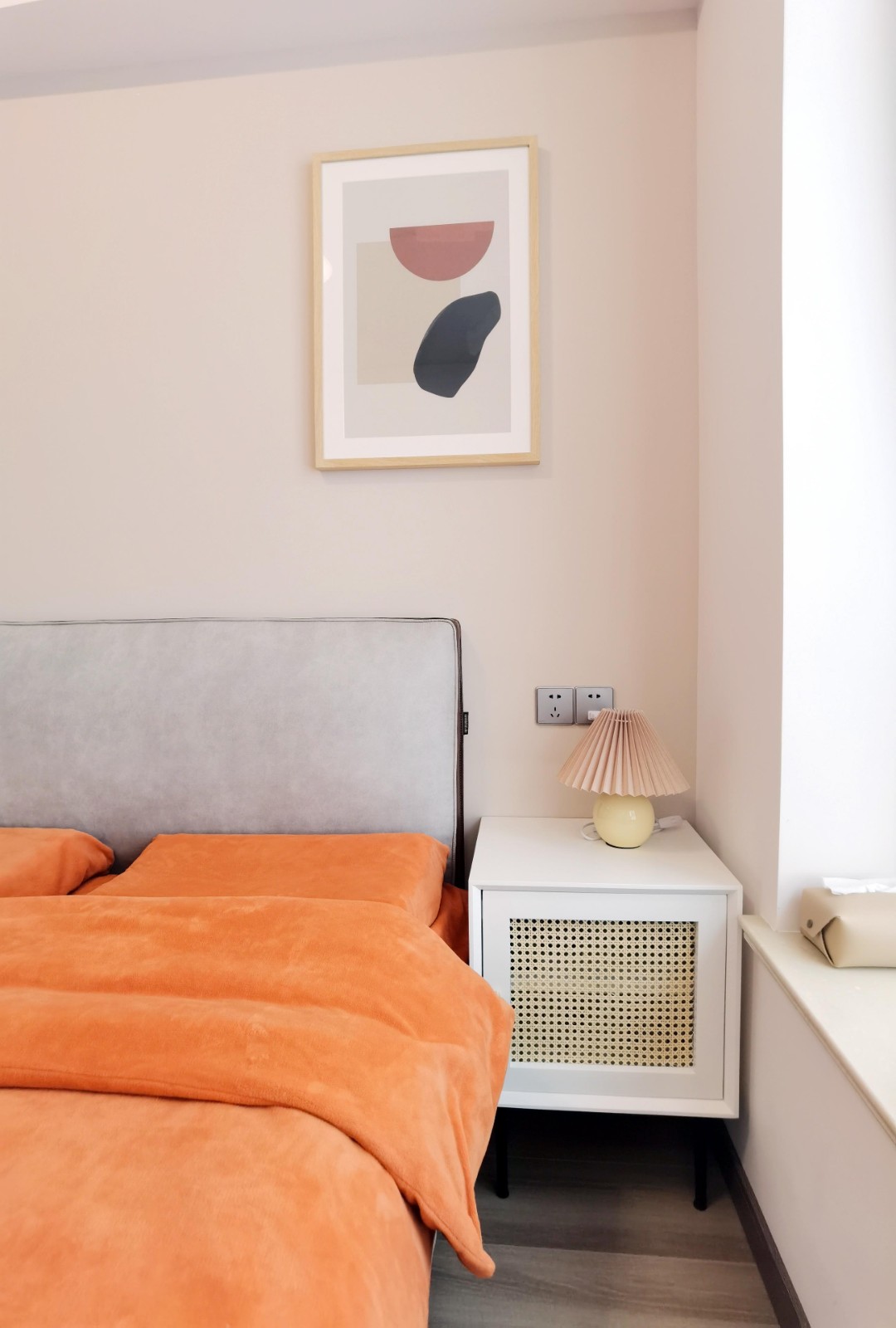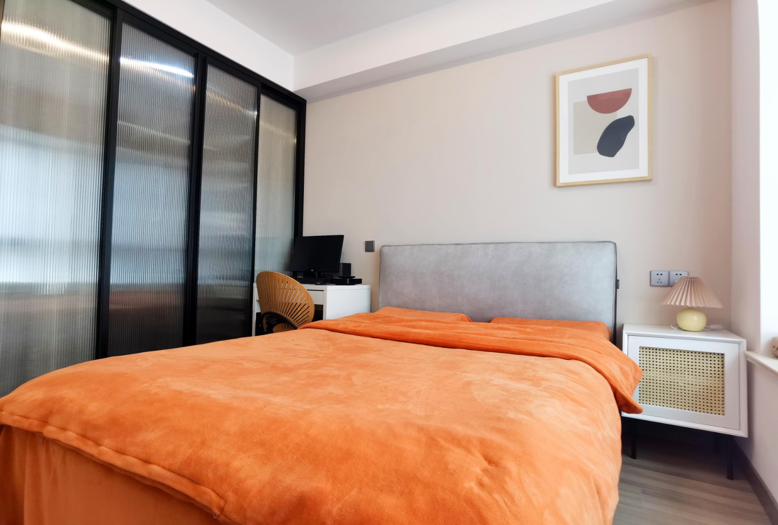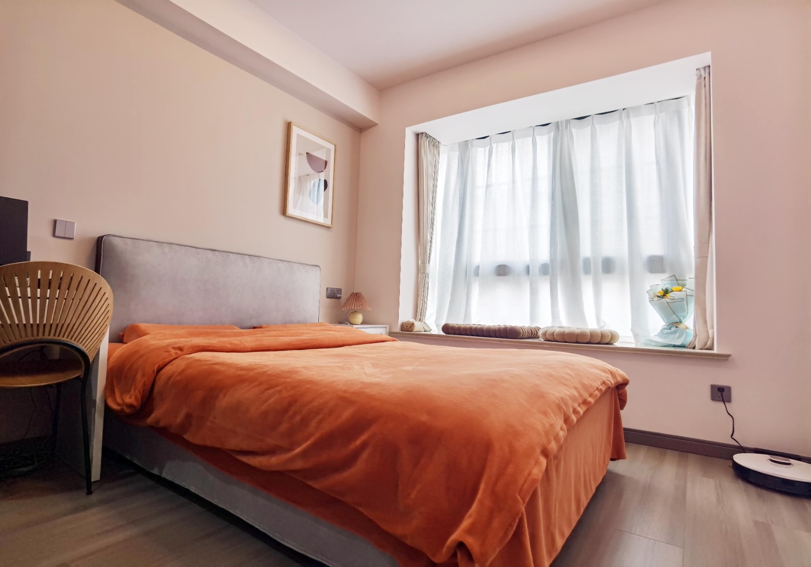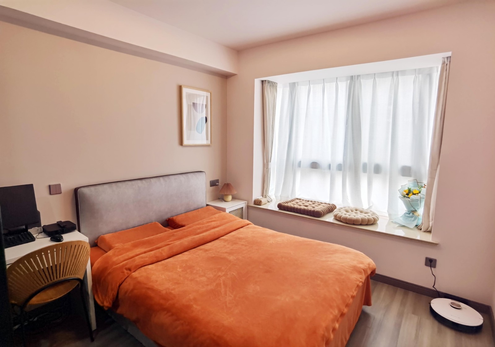不大不小的8平米臥室,有一張小梳妝臺(tái),外飄窗和一張一米五的雙人床,房間沒有配備電視,取而代之是一面可供投影儀投放的白墻,還有一個(gè)近3平米的衣帽間,這里承載了這個(gè)家三分之二的衣物儲(chǔ)藏