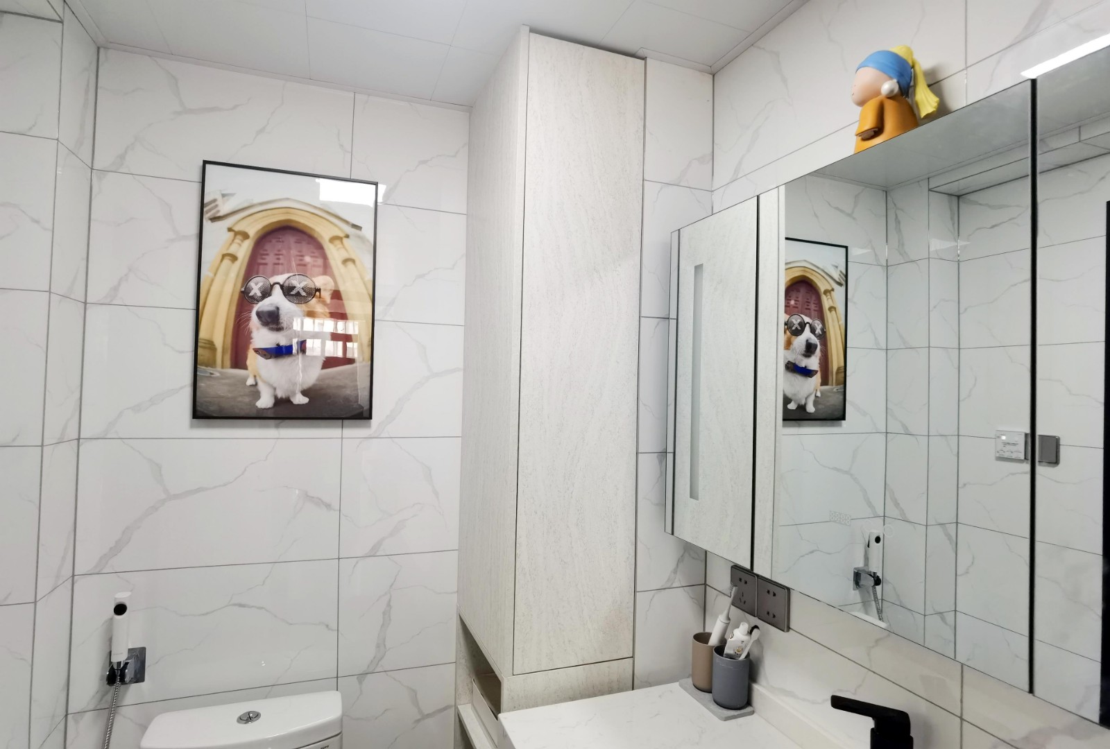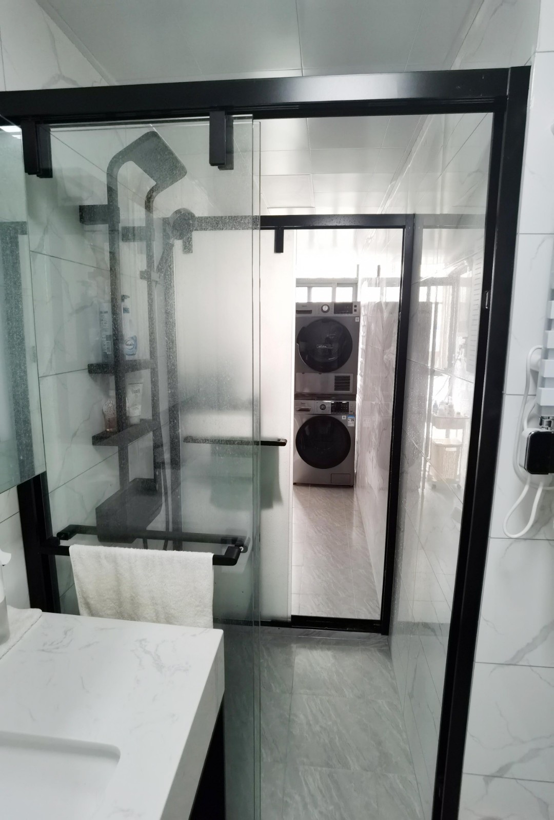 生間還是延續(xù)公區(qū)的黑白灰基調(diào),淋浴房處有兩扇玻璃移門,靠近室外的這個(gè)移門,打開就是生活陽臺(tái),供晾曬洗衣使用