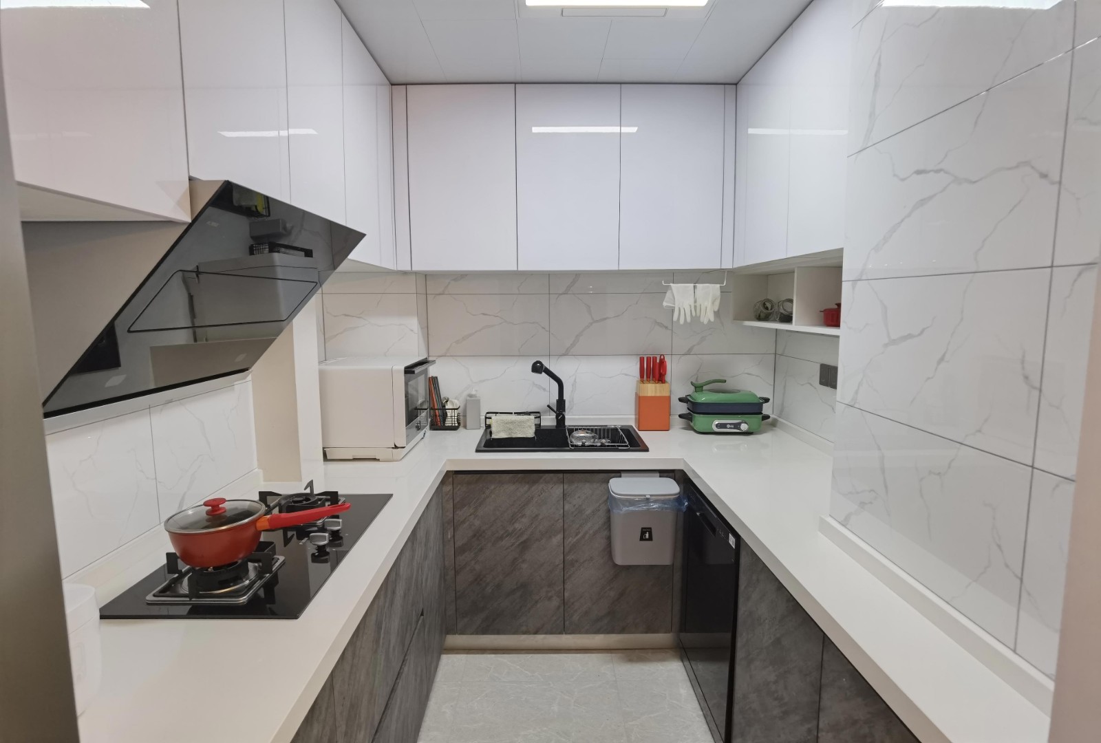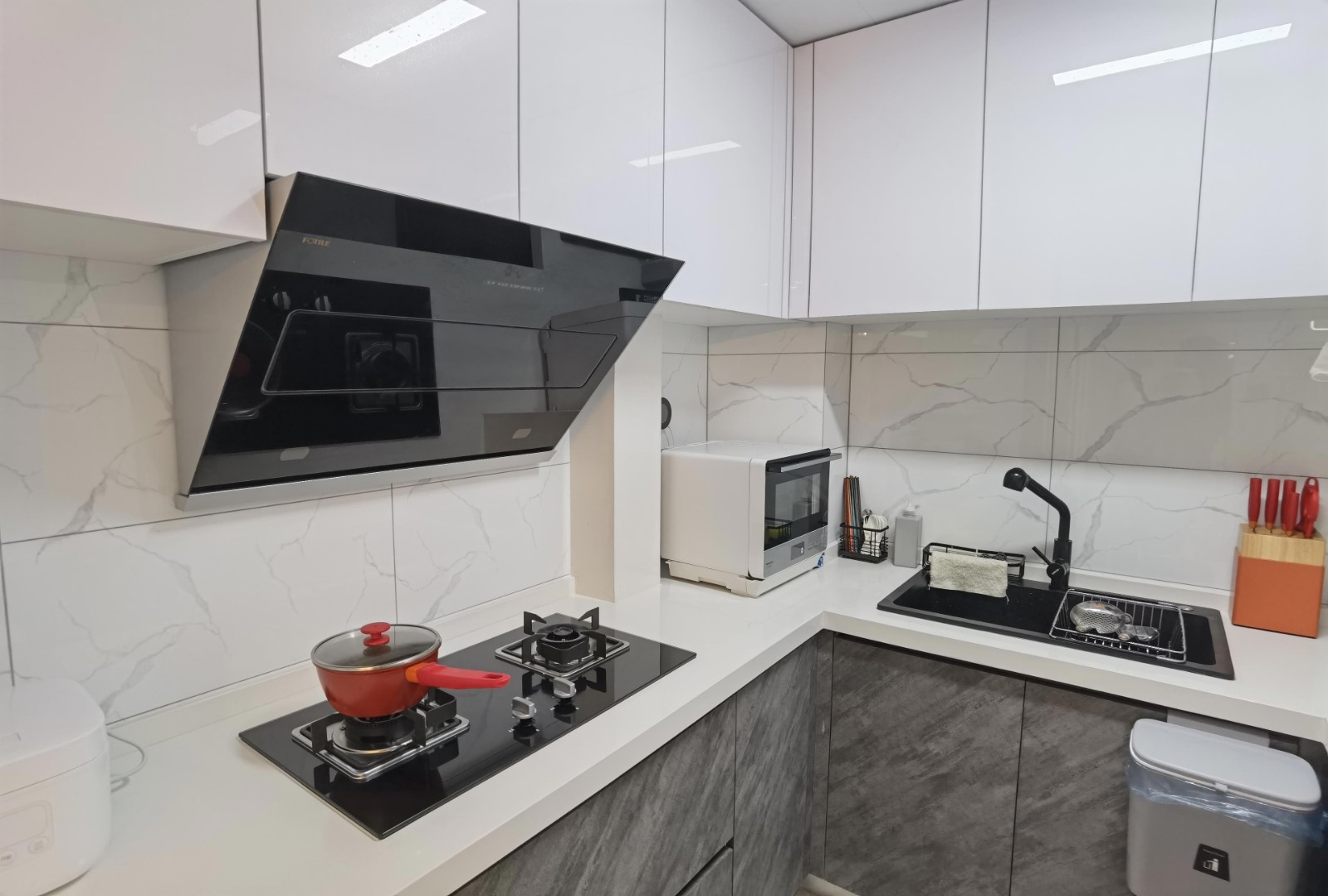 目前是開放式廚房,沒有直接采光和通風(fēng)的窗戶,光線比較暗,在顏色選擇上不宜深,但又要跟整體風(fēng)格協(xié)調(diào),所以在下柜門板的選擇上 取男女主人都喜歡的灰色系列巖板柜門,上柜則選擇亞克力白色門板去提亮