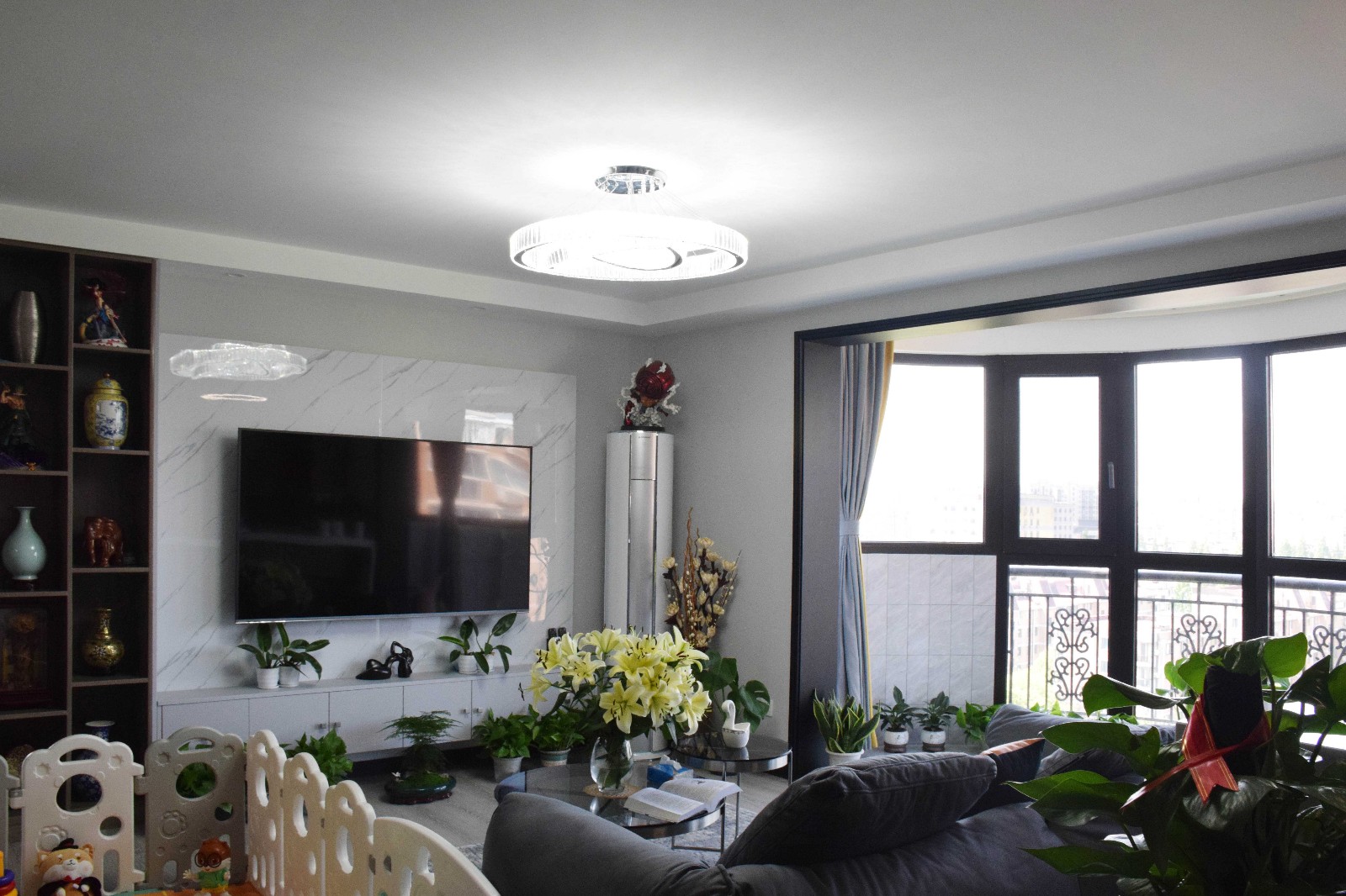 電視機展示柜搭配大理石板,木紋與石材,材質(zhì)和顏色之間的碰撞,讓空間更立體有趣味。黑色的埡口門套收口太空漫步顏色的乳膠漆,穩(wěn)重大氣在視覺中漫延。