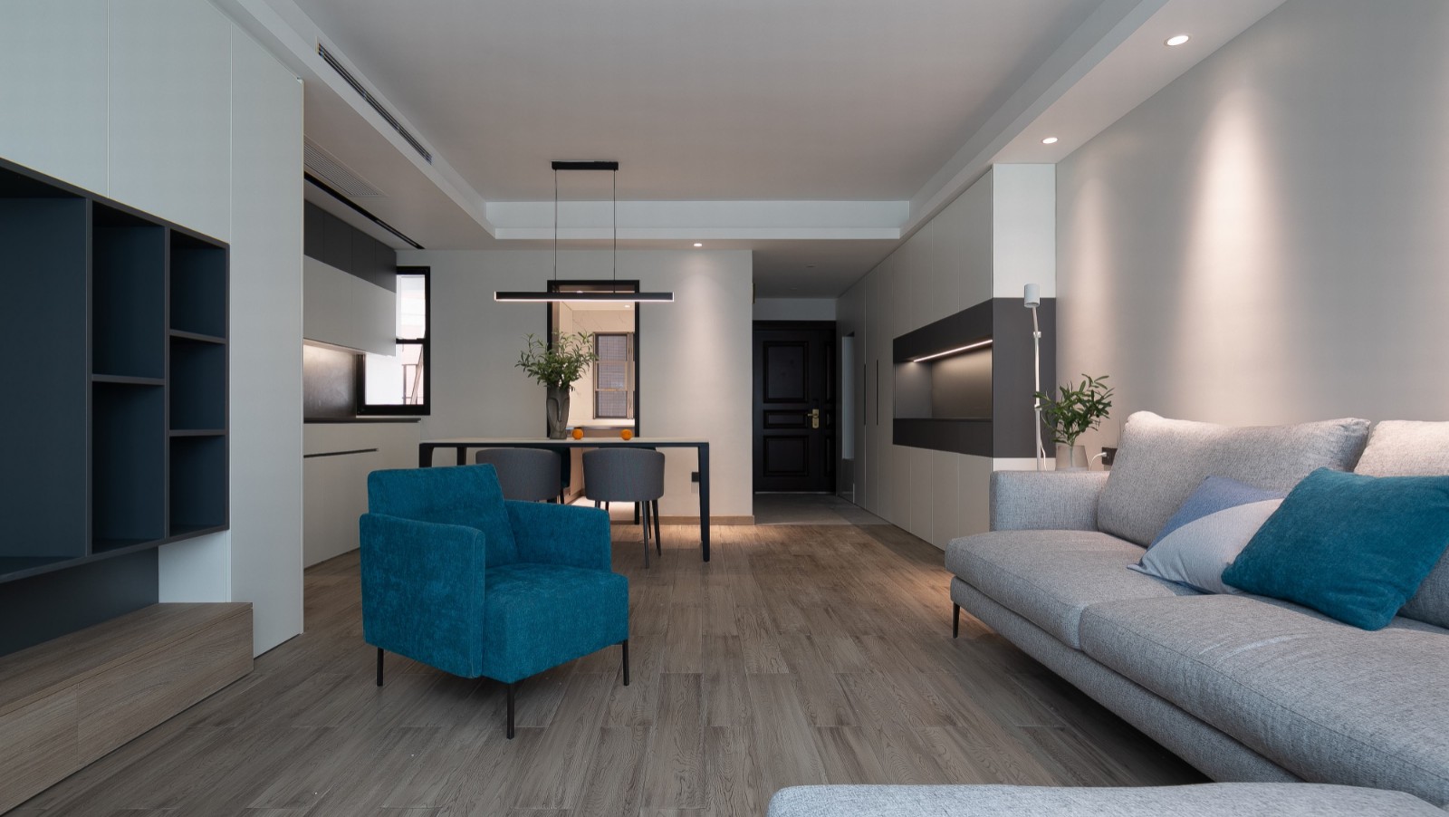 灰色轉(zhuǎn)角布藝沙發(fā),造型簡約,金屬底腳增加時尚與清涼之感。再看看那副猶如“一汪藍色海洋”的掛畫,設(shè)計師也巧妙的將這汪“流動的海水”定格于背景墻,并搭配海洋藍的布藝單椅和抱枕,是不是已經(jīng)感受到了些許海岸的絲絲清涼呢?