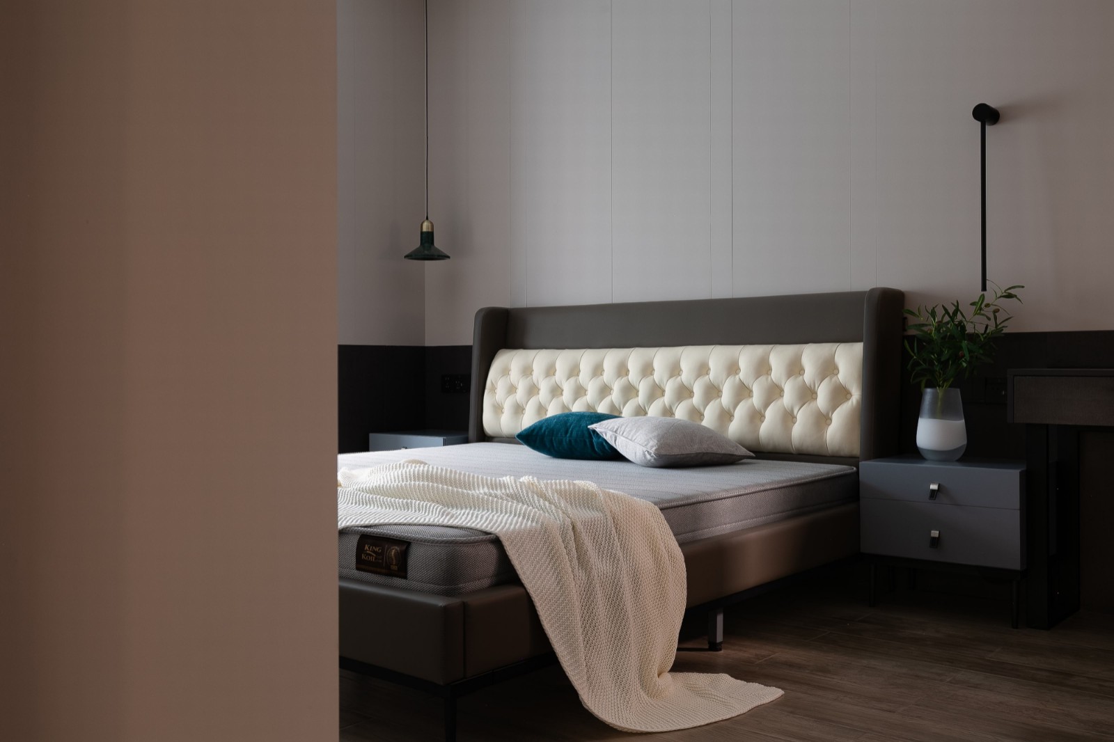 看!遠處那緩緩飄來的朵朵白色軟包,就像忽而從海面深處飄來的棉花云朵,簡單干凈又讓人忍不住想去掐掐,搭配深棕色原木柜體及書桌,深淺色調(diào)互補,典雅又和諧
