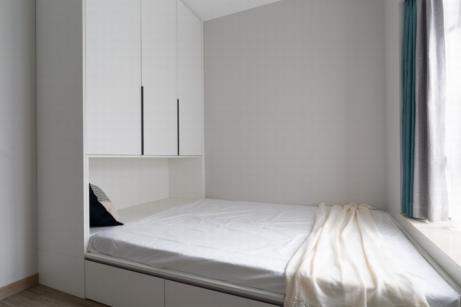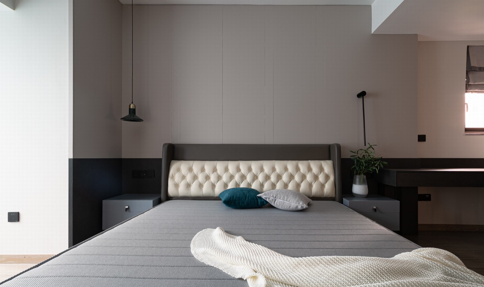 淺灰藍色的床頭柜,顏色柔和不跳躍,同時充當著空間色彩的緩慢過渡作用,統(tǒng)一協(xié)調(diào),又不尷尬。淺藍色的紗簾柔和了直射的陽光,也給整個主臥營造了一個自然而寧靜的睡眠空間。