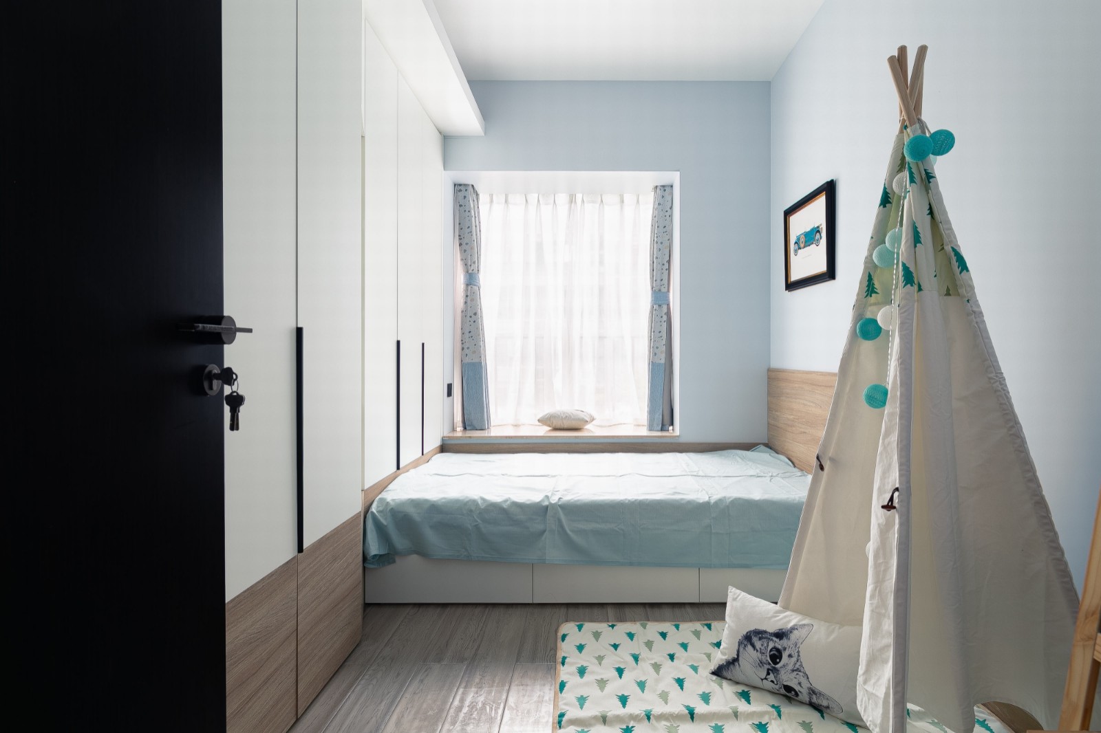 不過,相信細心的朋友們已經(jīng)發(fā)現(xiàn)了,平面圖緊靠床頭的書桌和一個小置物柜暫時是擺了一個小帳篷和一個小黑板呢,這并不是我們設(shè)計的錯誤哦~因為小朋友還小,需要更多的活動娛樂空間,而這個部分,將來也會由書桌和小置物柜來代替哦~