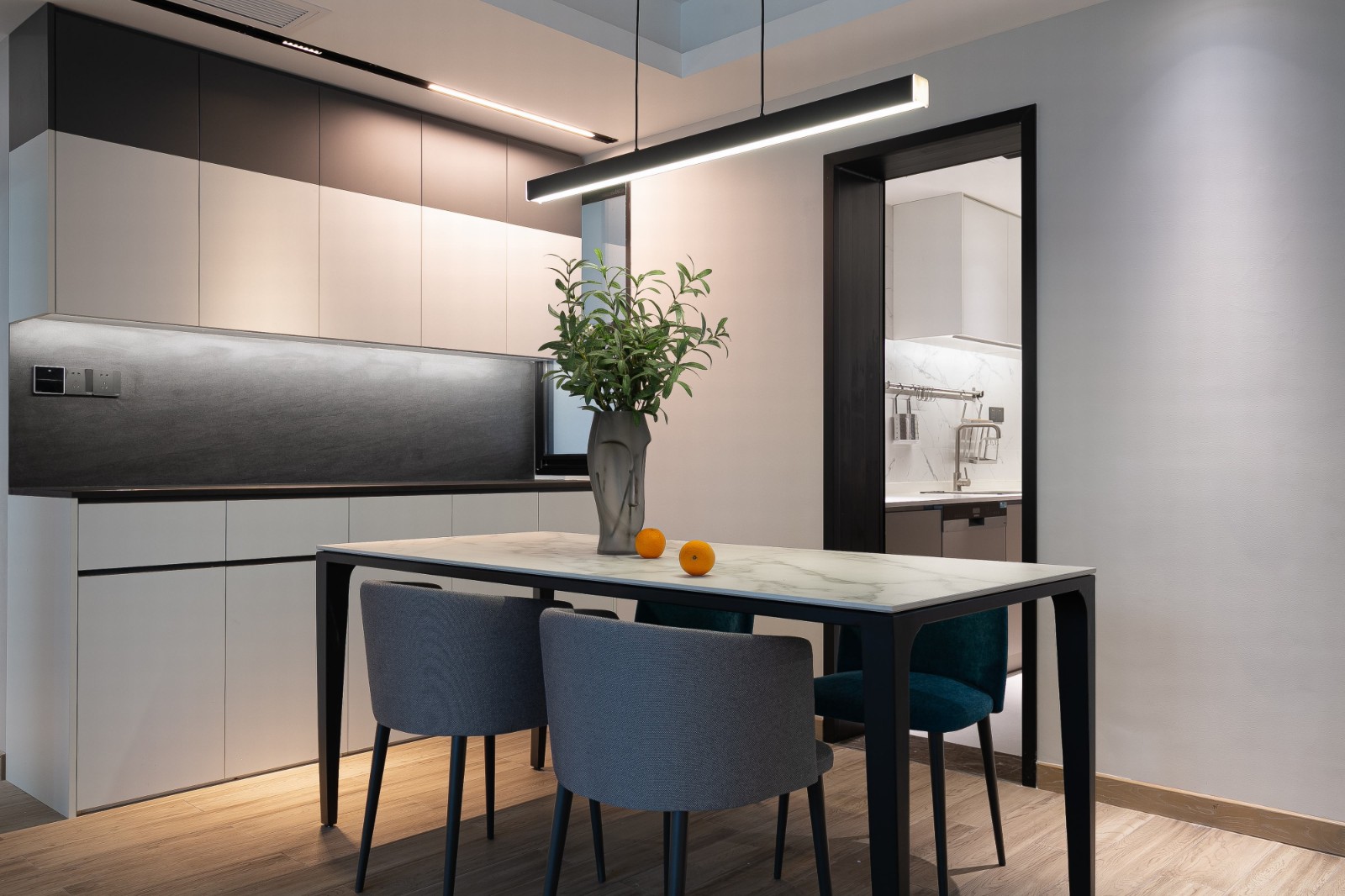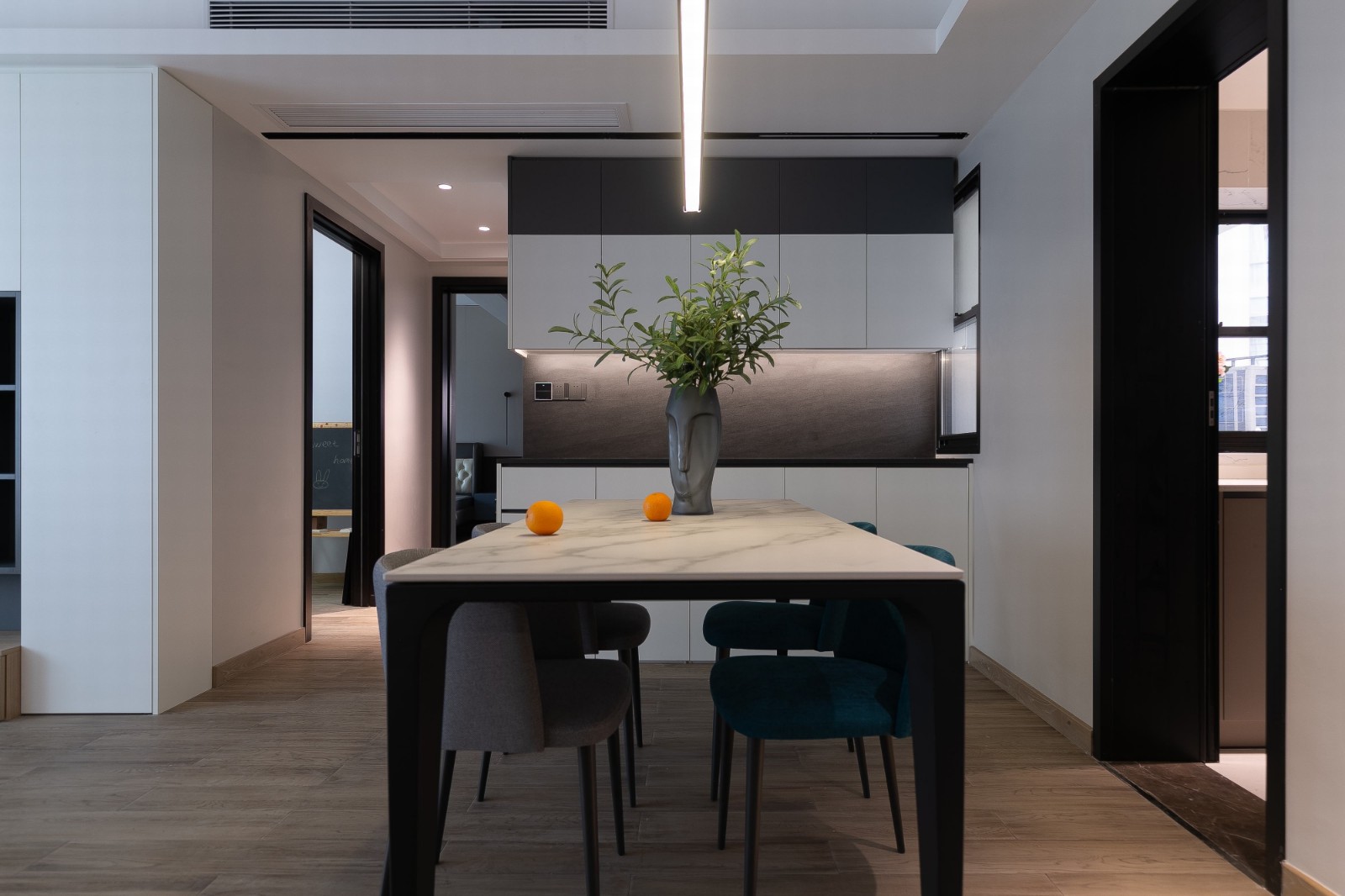 在簡約現(xiàn)代的餐廳風(fēng)格布置中,圓角金屬腳架及大理石臺面餐桌,整體保持清新冰涼的視感與觸感,這種天然材質(zhì)與現(xiàn)代質(zhì)感元素的混搭運用,別出心裁,令人眼前一亮