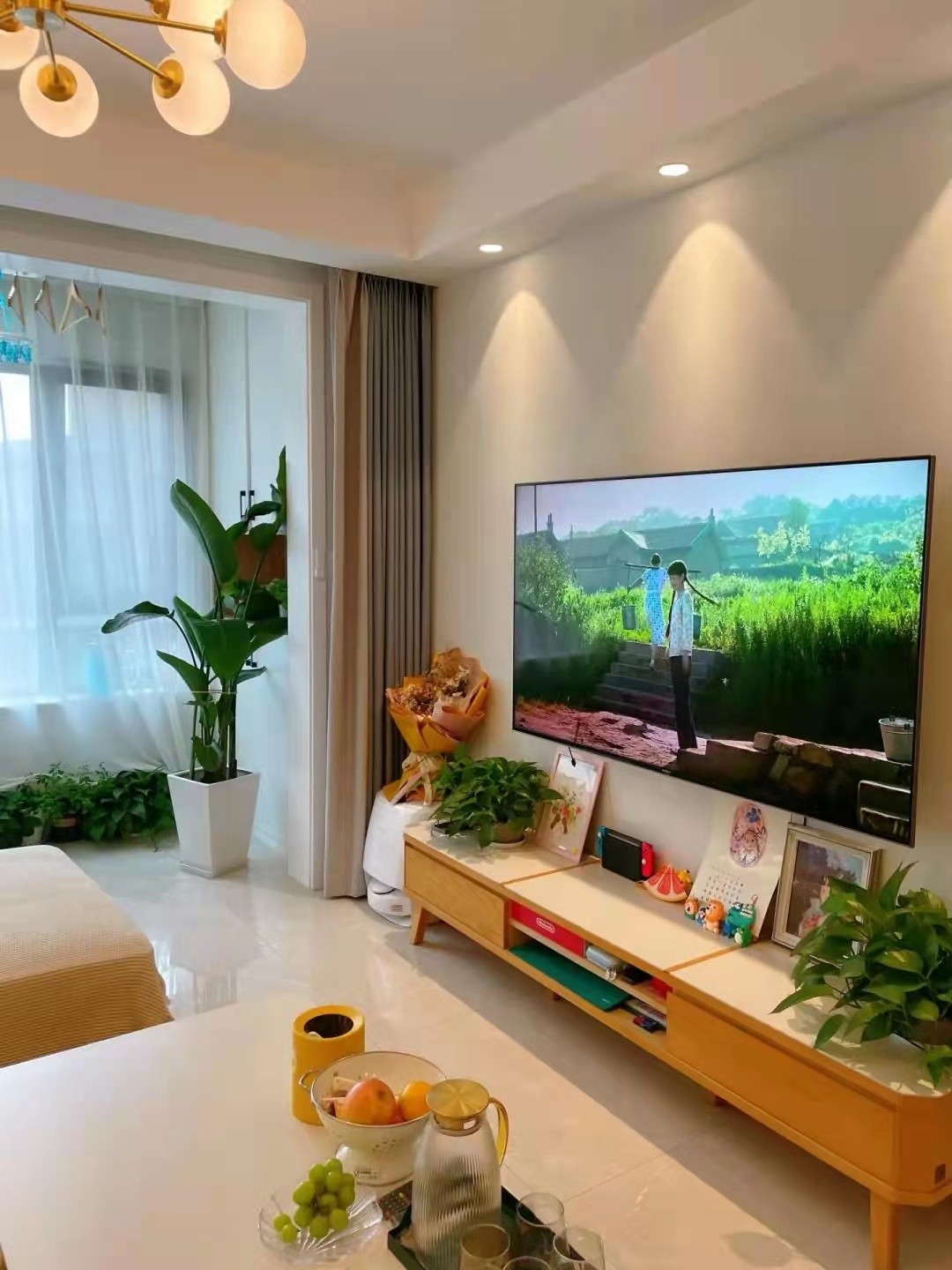客廳電視背景墻沒有做任何造型,直接刷了乳膠漆,簡單又好看。電視機直接懸掛墻上,比放在電視柜安全,更節(jié)省一些空間。坐在沙發(fā)與家人一起聊聊天,看看電視,太幸福了。布置了很多植物,特別有家的味道,看著花花綠綠的植物,心情很開心