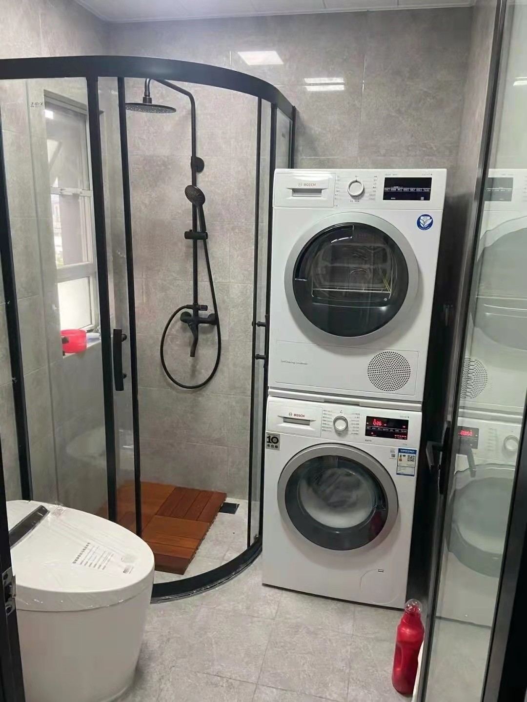 衛(wèi)生間空間合適,做了干濕分離,做保潔的時候會方便很多。旁邊的位置可以放冰箱和烘干機,使用特別方便。干濕分離空間足夠,視覺上特別大氣