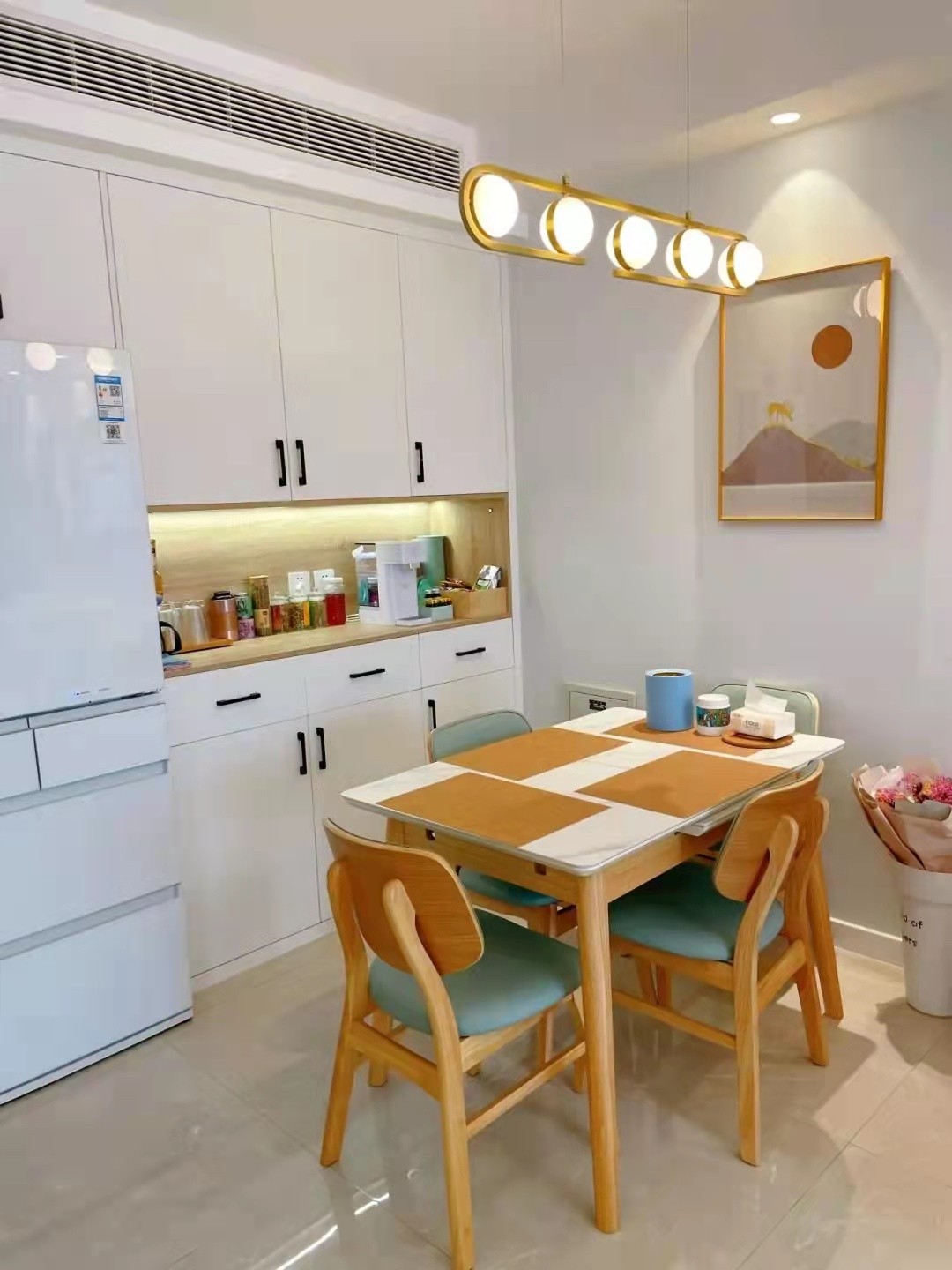 餐廳布置了一張方形餐桌,原木色的效果顯得很溫馨,特別棒!旁邊預(yù)留了位置可以放冰箱,顯得很有設(shè)計感,大小位置合適,真心不錯。餐邊柜中間留空位置,可以放一些常用的小東西,使用到的時候方便很多。頂面安裝的吊燈,款式真心不錯,晚上照明亮度足夠,時尚又好看。