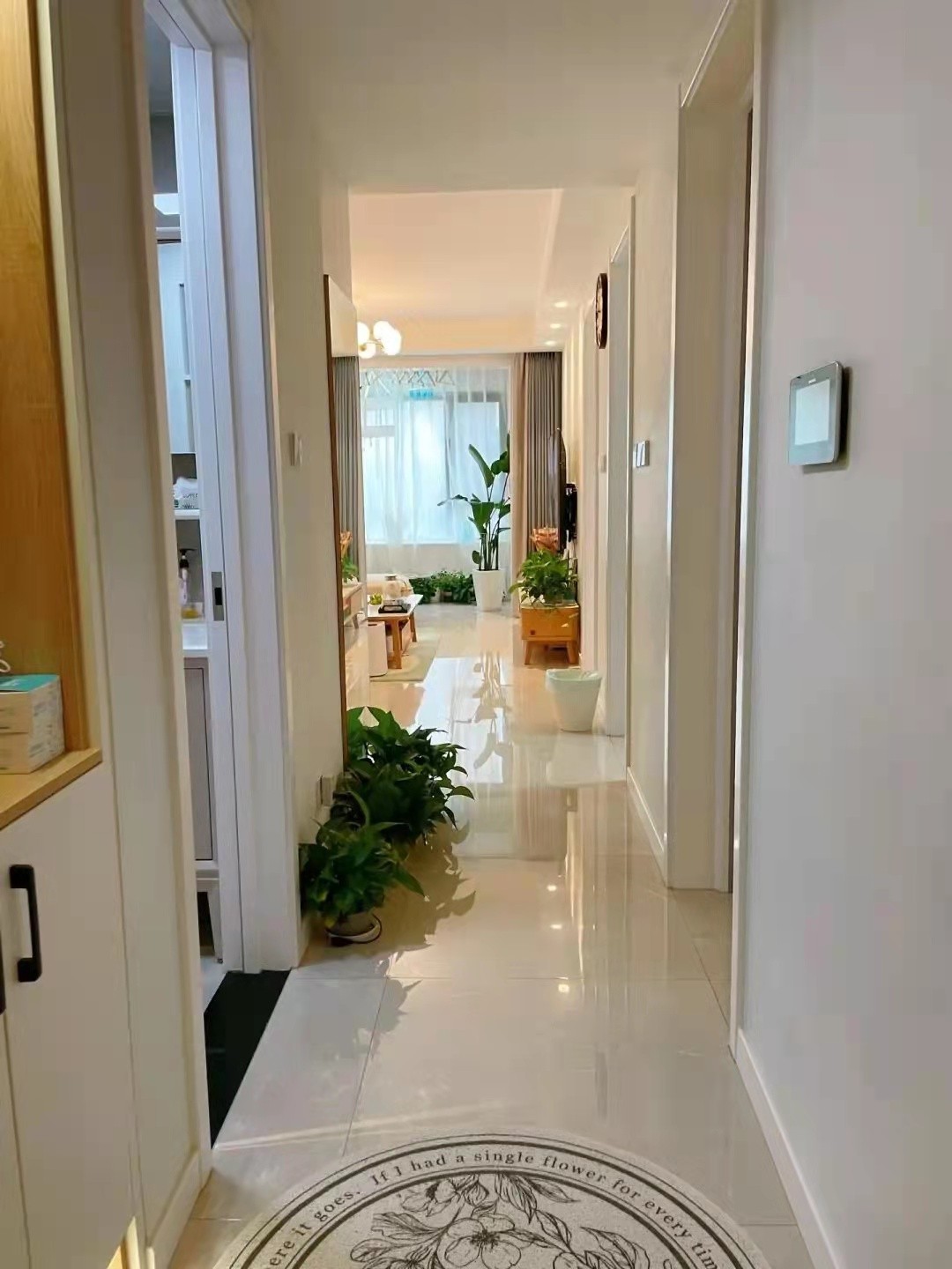 站在門口的角度,左側(cè)就是廚房了,所以可以把其中一部分的墻體打掉,做了嵌入式上下兩層的柜子,地面放著植物,特別有家的味道