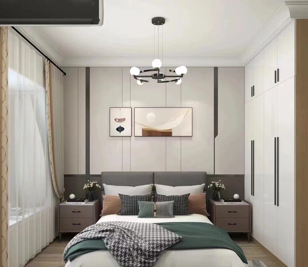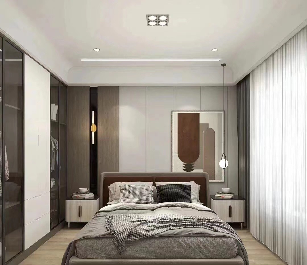 床頭柜顯得更加別具,將衣柜做成了落地推拉門,可以收藏更多得衣服,更加方便,實用。