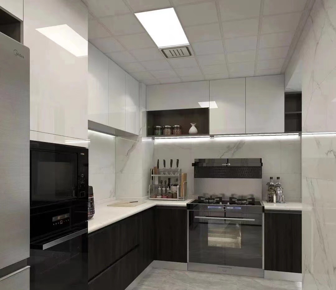 廚房全部用的是瓷磚,采用灰黑搭配,定制了收藏柜,更加實用。
