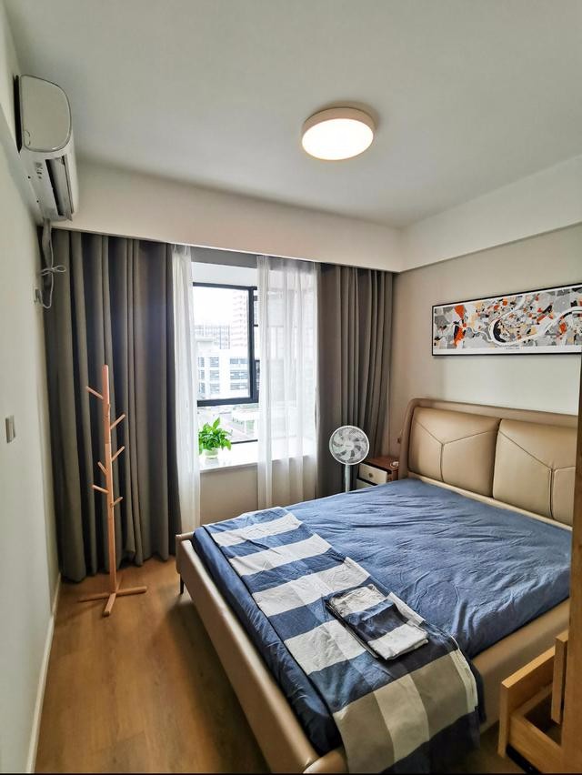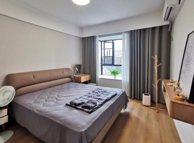 主臥原本擁有獨(dú)立的衛(wèi)生間,不過考慮到需求,舍棄了主衛(wèi),不影響使用。家里能舍棄主衛(wèi),真的鼓起了很大的勇氣了。一個定制衣柜加上一張雙人大床,基本沒有什么多余的空間。也布置了網(wǎng)紅款的原實(shí)木晾衣桿架,顏值特別高,很實(shí)用。