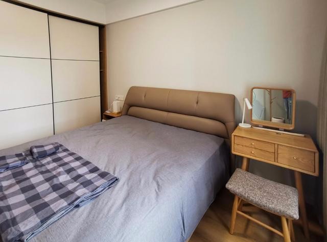次臥空間小,布置了一張雙人床加上一個定制的衣柜基本沒有什么多余的空間了,床頭 墻上懸掛著裝飾畫,可以起到很好的裝飾效果,特別讓人滿意。