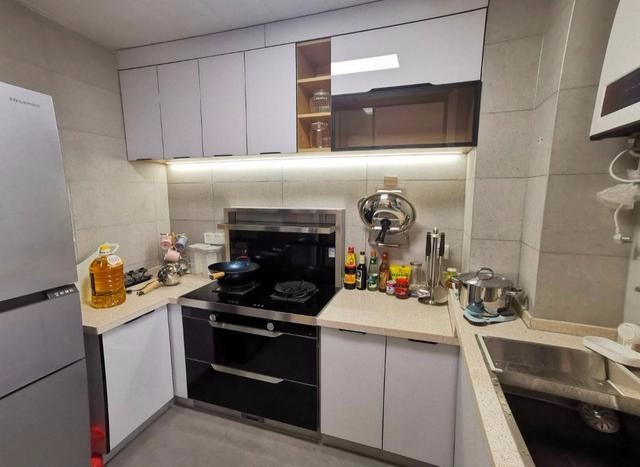 廚房根據(jù)空間定制了“U”型櫥柜,布局形成了“洗、切、炒”的順序,操作起來非常方便。安裝的是集成灶,節(jié)省空間,油煙處理效果更能讓人滿意。每次使用廚房,都會收拾整齊干凈,東西不會到處亂放。