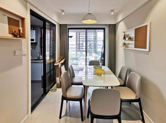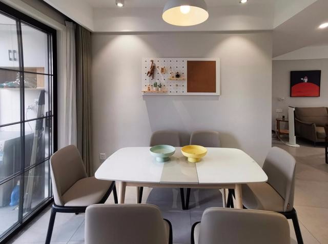 餐廳空間比較緊湊,考慮到這點(diǎn),布置了一張巖板材質(zhì)方形餐桌,占用的空間大小位置合適。常規(guī)搭配了六把餐桌,平時也足夠使用了哈。左側(cè)移動門進(jìn)去就是廚房了,煮好的飯菜可以很快端出來,方便用餐。