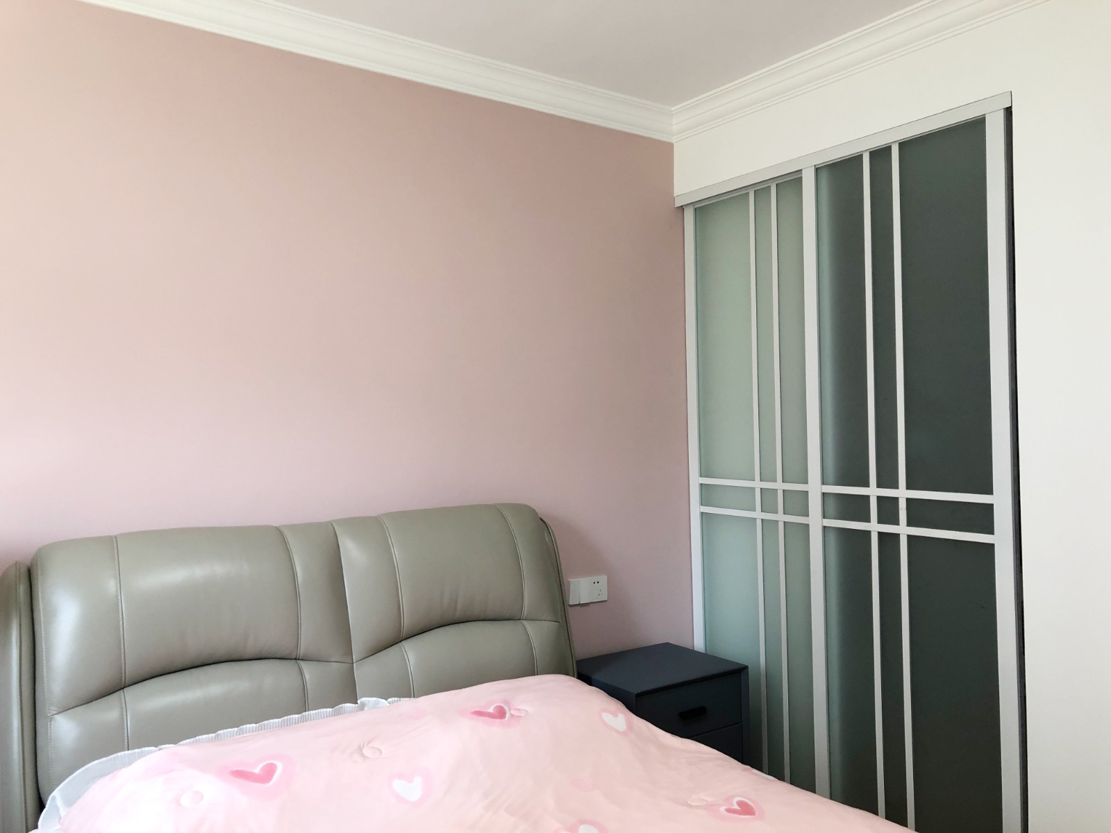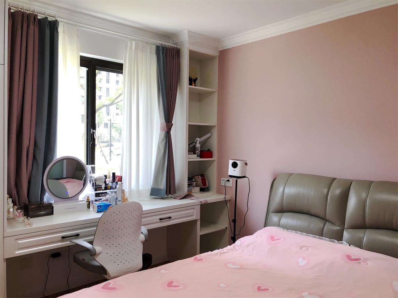 主臥我們以亮色粉色為主安裝了投影儀,旁邊坐了一個化妝柜,在滿足收納的同時更方便日常的生活需求,