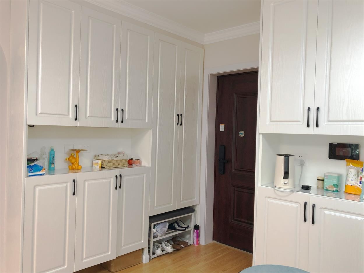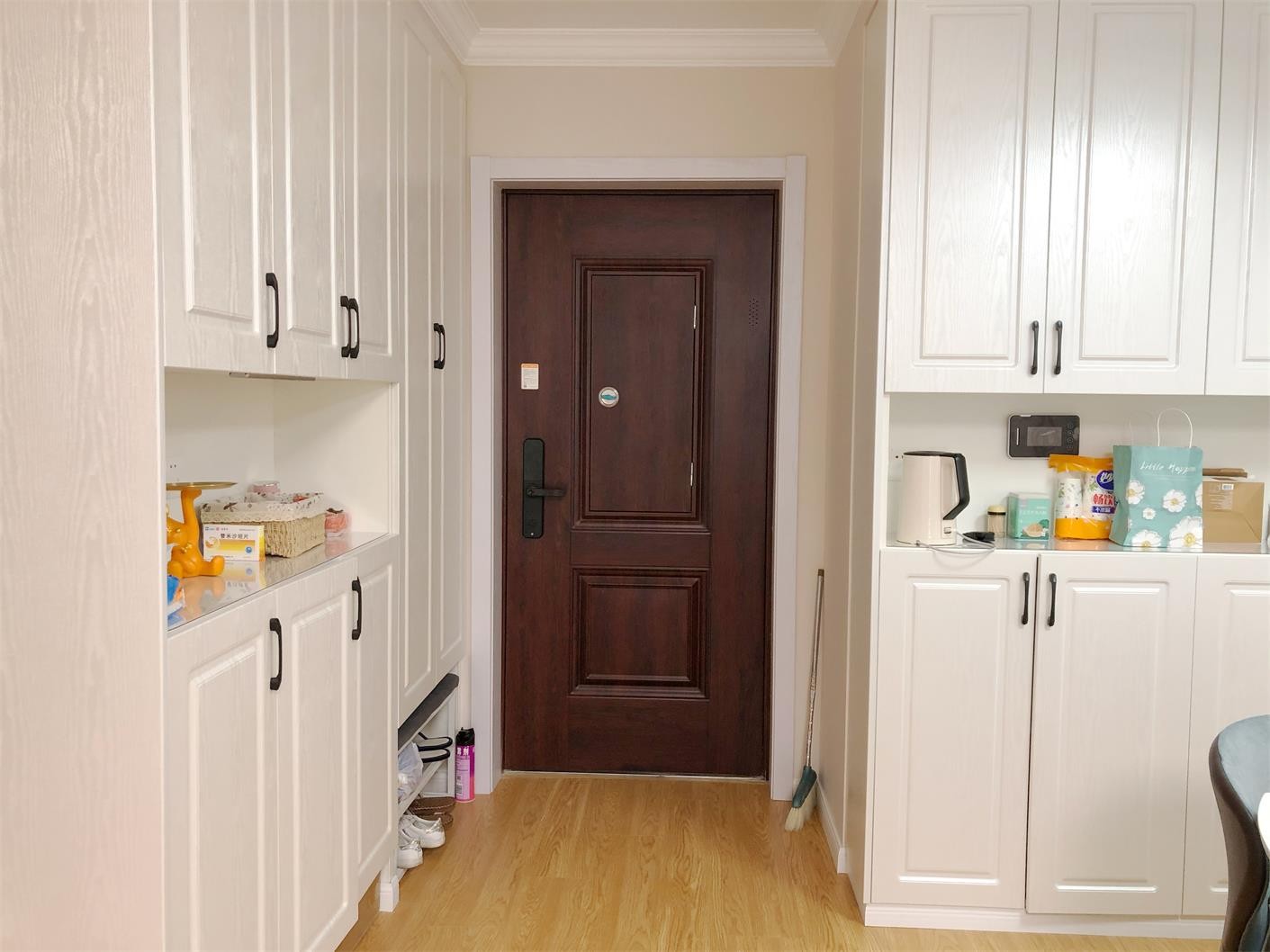定制了一個衣帽間,在外面看著平平無奇,但是里面的空間是很大的,三面都是收納空間,白色與風色的拼裝更加的溫馨。
