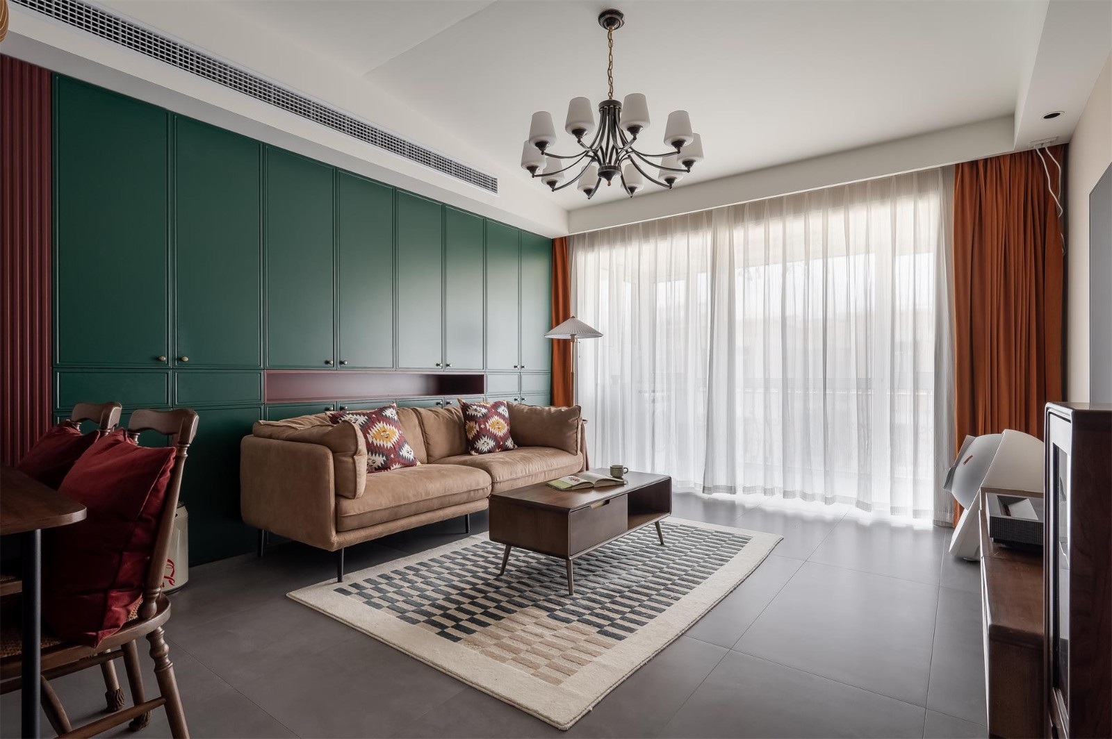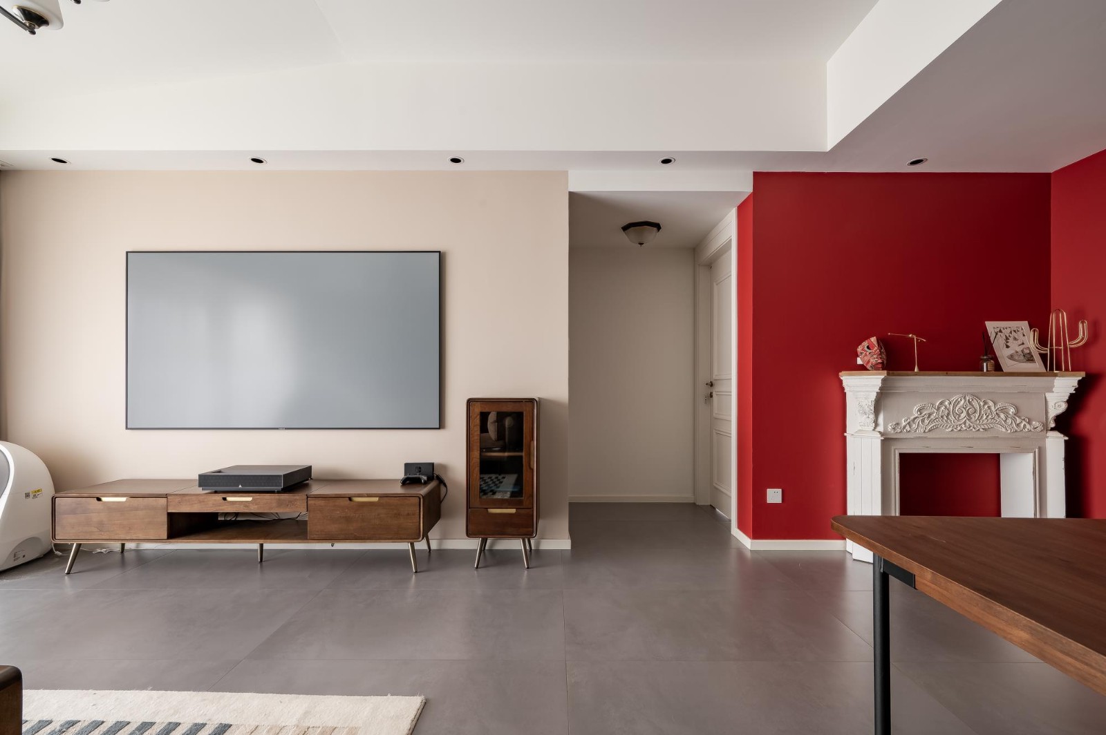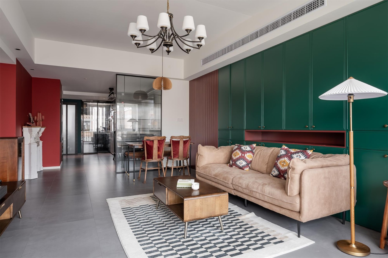沙發(fā)背景墻用“勃艮第紅”搭配綠色系的“冰海航船”,經(jīng)典的紅綠配色再看萬(wàn)眼都是驚艷的,中間鏤空的設(shè)計(jì)是業(yè)主放置手辦的地方。原本墻面這里凸出去一片區(qū)域,現(xiàn)在一整面墻做通頂收納柜,這里搖身一變成為一個(gè)大大的儲(chǔ)物間,進(jìn)深100cm,能收納更多物品。