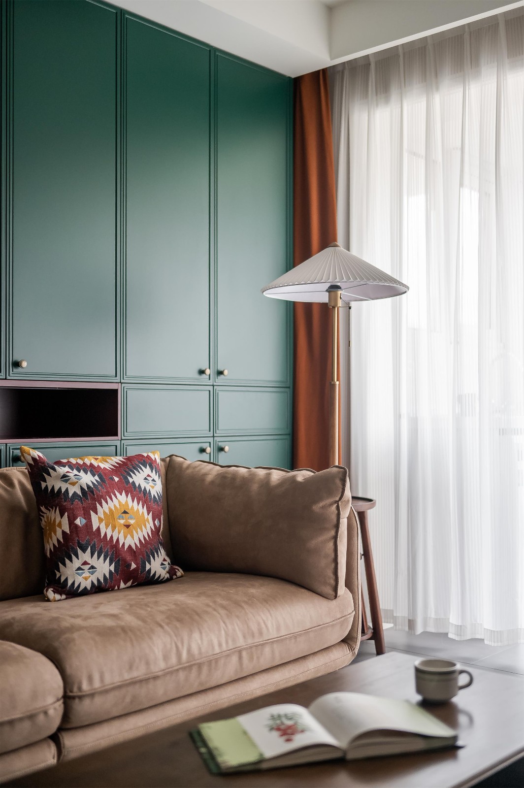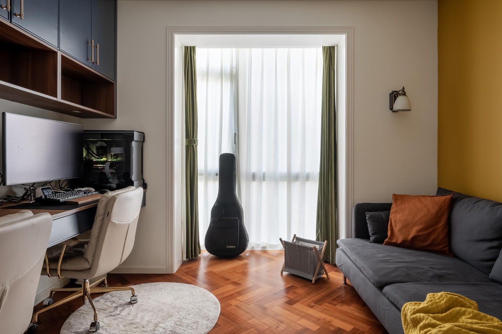 雙人沙發(fā)搭配黃色系的“羅馬假日”色背景墻,亮色抱枕點(diǎn)綴為空間增添些許色彩。沙發(fā)是女業(yè)主從宜家選購(gòu)的,復(fù)古藍(lán)的布藝沙發(fā)與整體風(fēng)格相協(xié)調(diào)。這個(gè)家的又雙叒叕一個(gè)新色。橄欖綠色的絲絨窗簾,清新又有活力。