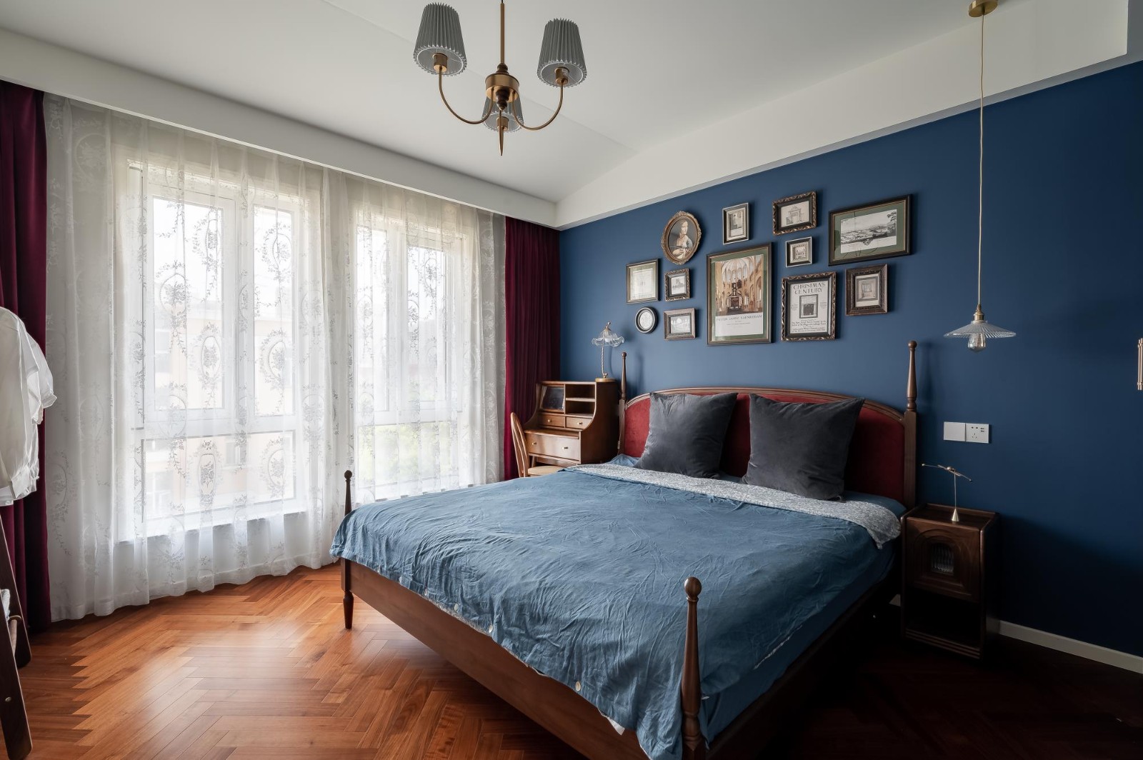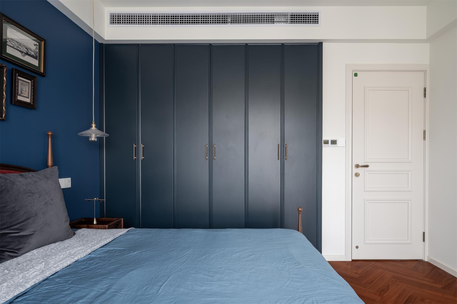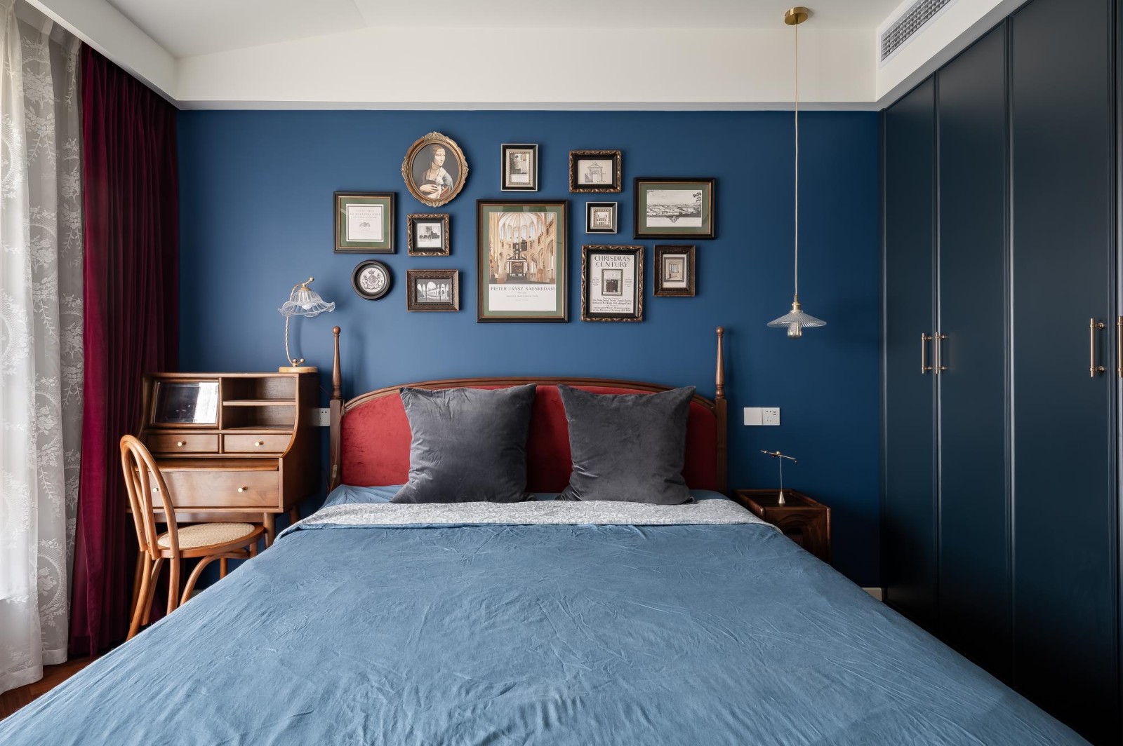 床背景墻這里我們又運(yùn)用了新的色彩,近年來(lái)裝修色彩界的網(wǎng)紅,布里斯托藍(lán)。相框懸掛點(diǎn)綴,充滿歐式風(fēng)情,自古紅藍(lán)出cp,整體相得益彰,這個(gè)家更像是一個(gè)藝術(shù)展廊。