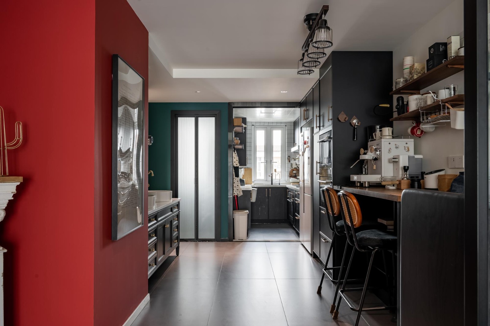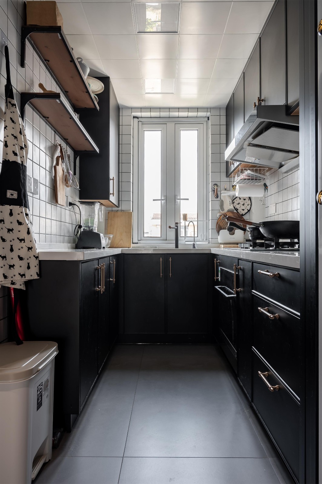玻璃門推開(kāi)是廚房?jī)?nèi)部,整體u字形布局,洗菜、切菜、烹飪動(dòng)線合理。櫥柜的設(shè)計(jì)小廚房也有大儲(chǔ)物,收納上墻,大單槽臺(tái)下盆清洗不濺水。 這個(gè)家,復(fù)古又現(xiàn)代。廚房鋪貼的是最近超火的小白磚,小白磚的鋪貼難度很大,可見(jiàn)施工師傅的手藝了。這個(gè)廚房,充滿生活氣息。