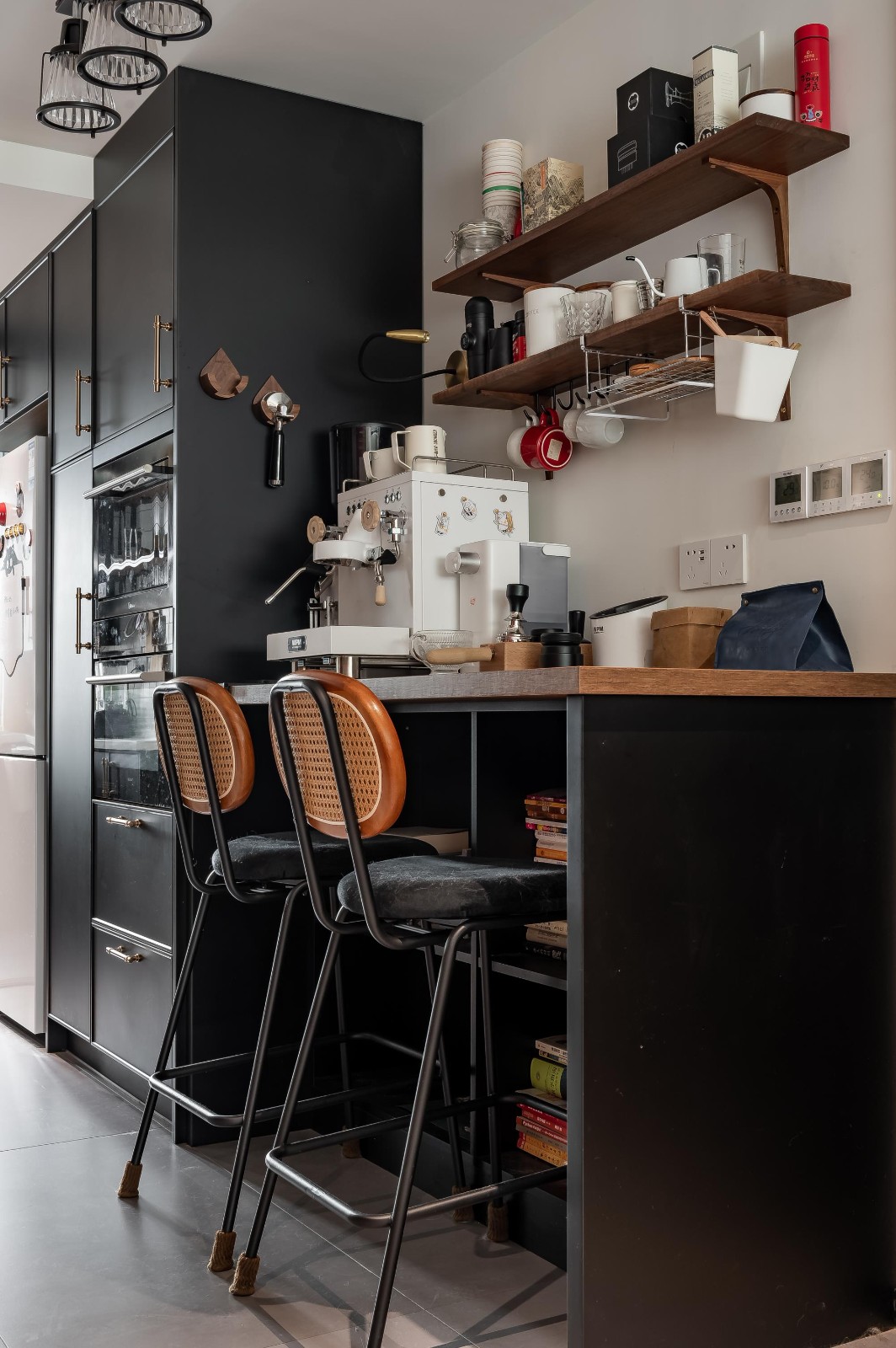 西廚區(qū)還設(shè)計(jì)了一個(gè)吧臺(tái),吧臺(tái)臺(tái)面是男業(yè)主選擇的加厚木板,紋理顏色自然質(zhì)樸,91cm高的吧臺(tái)搭配藤編高腳椅。男業(yè)主是一位咖啡控,一開(kāi)始裝修的時(shí)候就決定了家中要有吧臺(tái)區(qū)。 吧臺(tái)上方的隔板選用的是黑桃木,長(zhǎng)100cm,寬20cm,放一些咖啡所需要的物品,掛鉤上懸掛著各式咖啡杯,可見(jiàn)屋主對(duì)咖啡的喜愛(ài)了。