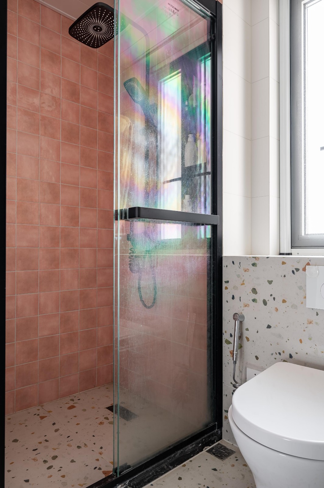 衛(wèi)生間門采用長(zhǎng)虹玻璃,由于衛(wèi)生間內(nèi)外空間都比較小,所以這里實(shí)際了不占用空間的折疊門。衛(wèi)生間內(nèi)部馬桶區(qū)、淋浴區(qū)干濕二分離,水磨石地磚顏色清新,淋浴間是臟粉色小方磚,一側(cè)做壁龕從,方便放一些洗浴用品。如果說(shuō)全屋是復(fù)古優(yōu)雅的,那么衛(wèi)生間則是清新亮麗的。