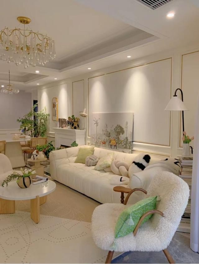 顏色搭配基本都是相近色系,家里硬裝基礎(chǔ)色調(diào)以大面積白色和灰色顯得有些冷,所以軟裝就以奶油色為主,這樣家里會(huì)很溫馨。