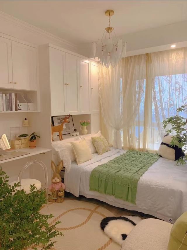 床后做了背景墻,不想太繁瑣,所以無(wú)床頭床是很好選擇。背景墻做的是白色護(hù)墻板,中間灰色硬包,基礎(chǔ)色搭配讓整個(gè)房間顯得寬敞不少,隨便一些裝飾品都很好看。