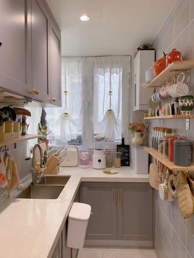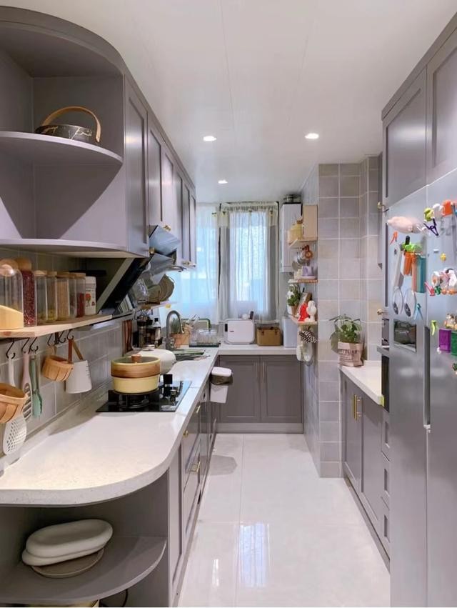 櫥柜顏色是莫蘭迪灰色系,臺(tái)面寬度54cm,U型布局中間過(guò)道預(yù)留110cm。