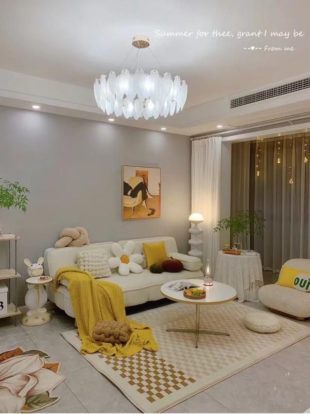 像巨型餅干一樣的米白色沙發(fā),搭配亮眼黃色系的抱枕和毯子,給人眼前一亮的感覺(jué)。旁邊增加了一盞糖葫蘆樣的落地?zé)?,讓沙發(fā)旁的空間可以更豐富一些。