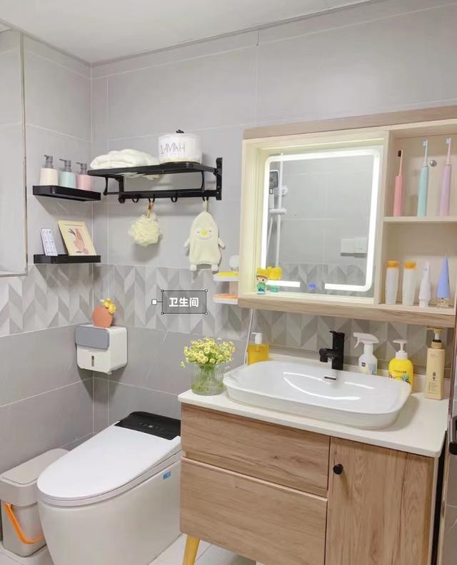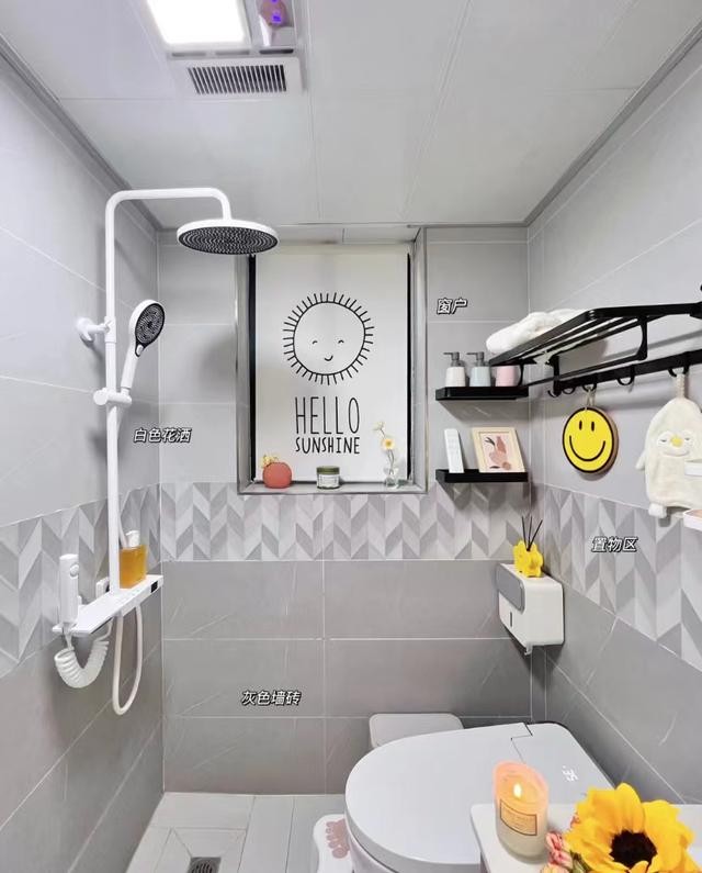 衛(wèi)生間的墻磚做了分色分區(qū)的設(shè)計(jì),底部灰色的墻磚,讓衛(wèi)生間的重心可以更穩(wěn)一些,中間花磚做腰帶,更有細(xì)節(jié)感
