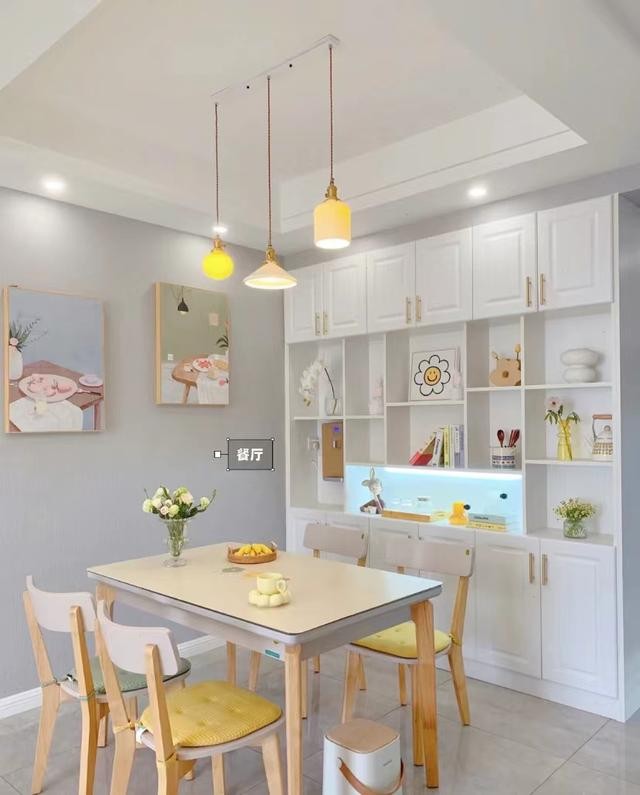 帶原木色的餐桌椅,桌子尺寸是80×130cm,搭配了4把椅子,一家三口用已足夠。餐桌鋪上米白色桌墊后顏值都提高了,平時(shí)吃飯掉的油漬一擦就干凈很方便。