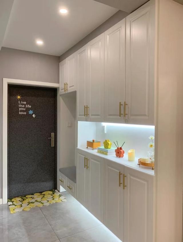 玄關(guān)部分柜子是白色實(shí)木免漆板,柜門(mén)也是純白色,回字造型,整體大氣,簡(jiǎn)單又耐看。中間鏤空區(qū):收納盒放鑰匙,用花瓶、香薰托盤(pán)等作為裝飾也很不錯(cuò)