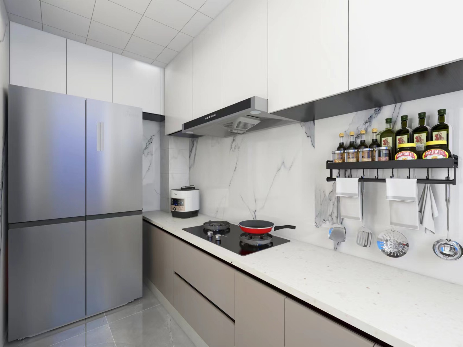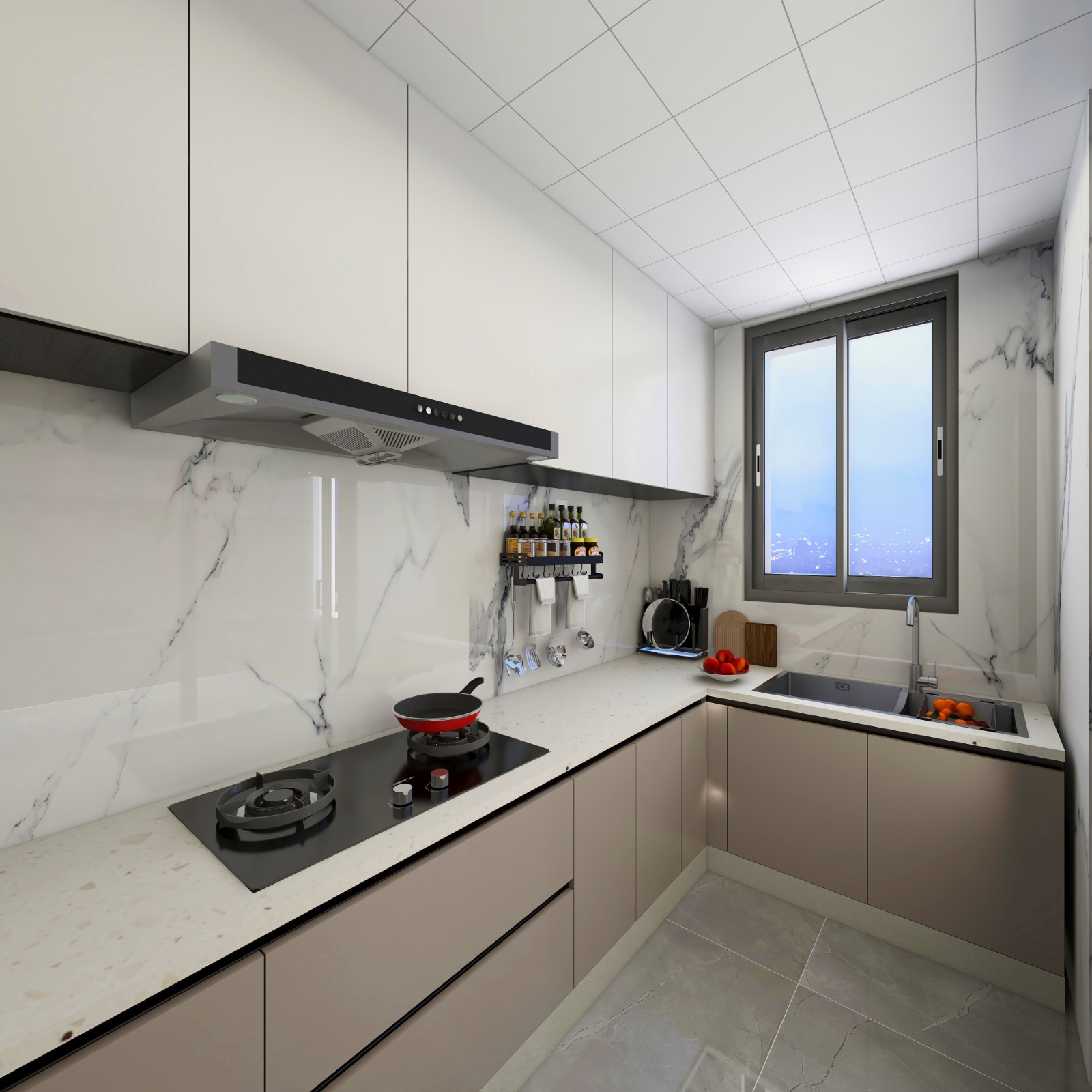 同樣廚房依然用的是嘉寶莉瑪爾波爵士白。廚房內(nèi)采用L型布局,灰色的地磚,原木色的櫥柜搭配白色的墻磚和白色的吊柜,這是北歐風(fēng)的氣質(zhì)。