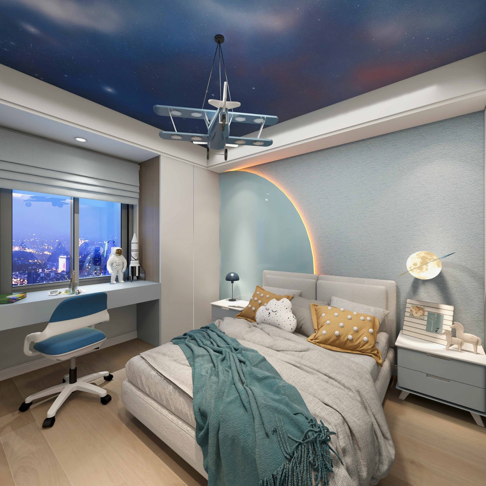 兒童房地面和吊頂依然延續(xù)了客餐廳的設(shè)計(jì),但是墻面的更加豐富了一些,融入了青藍(lán)色和淺灰色,低飽和度的色彩讓人的心情更加平和。運(yùn)用了嘉寶莉***地理 阿里星空2 男孩房床頭嘉寶莉雅晶石 JZL-103