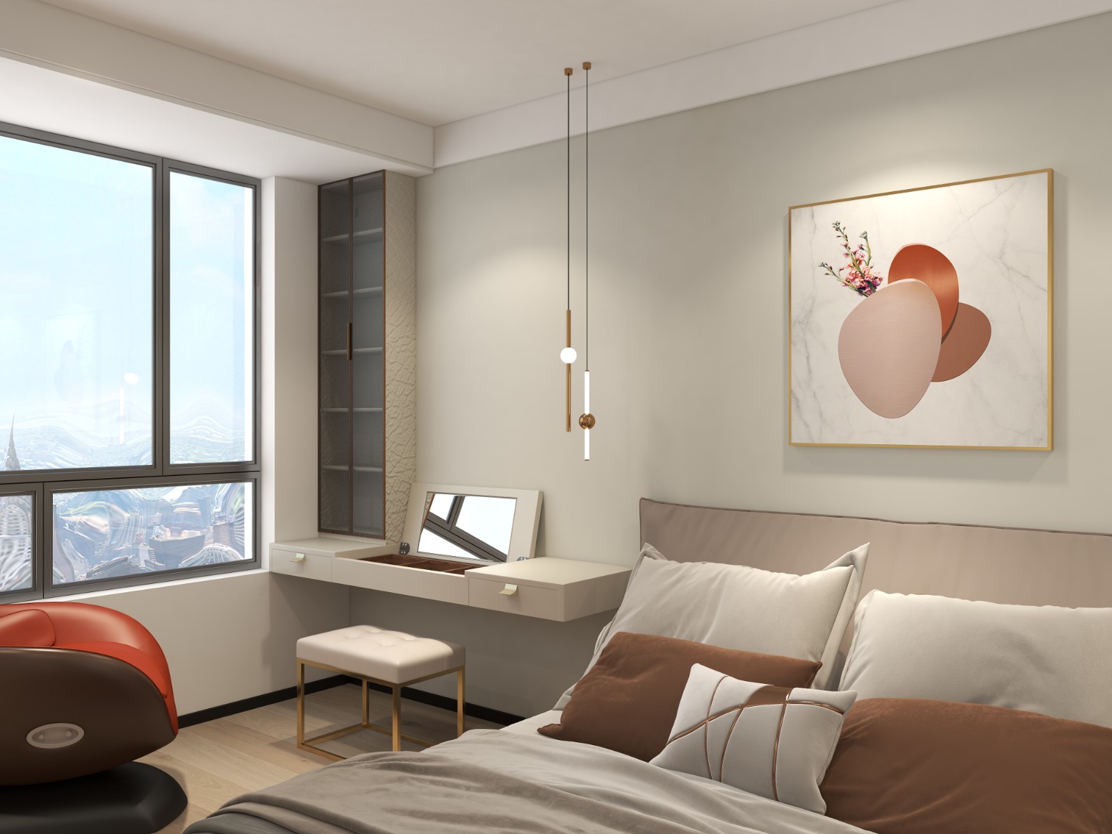 主臥整體色調(diào)更加柔和,背景墻選用嘉寶莉琺維托 V-26微水泥,多了幾份溫潤(rùn)柔和。