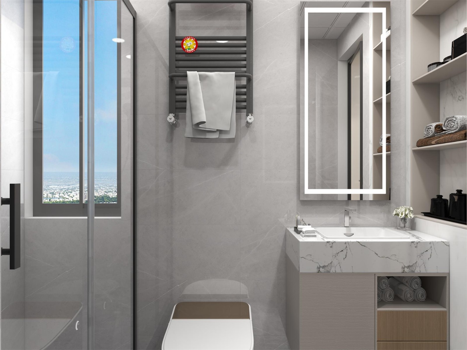 衛(wèi)生間的色調(diào)相對(duì)比較灰調(diào),增加親切感與趣味性