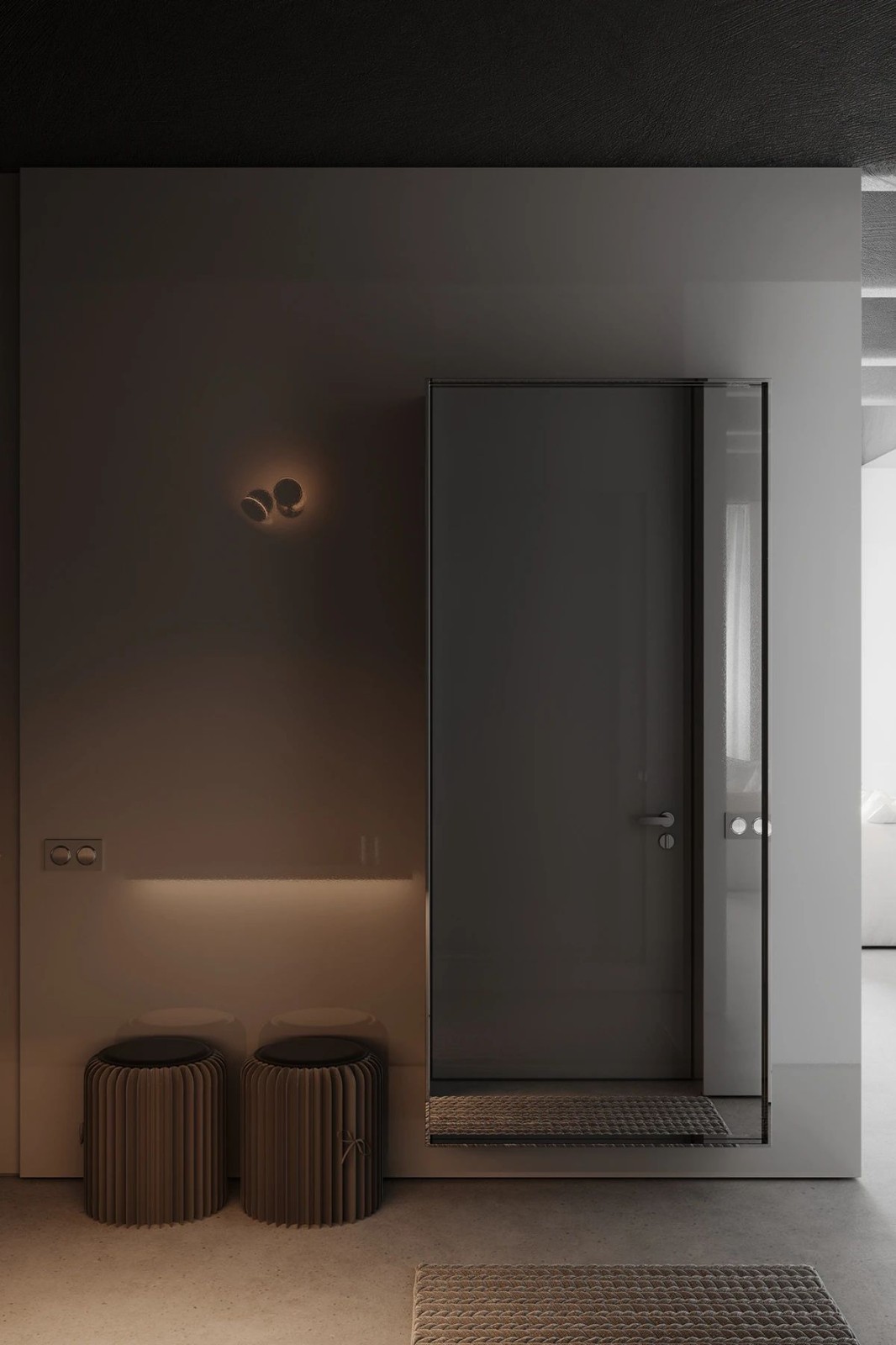玄關(guān)掛壁式鞋柜與穿衣鏡結(jié)合,起到一物多用的效果,旁邊兩個(gè)沙發(fā)凳方便穿鞋,再利用墻上的壁燈照明,不僅能渲染氛圍,設(shè)計(jì)更是別具一格。