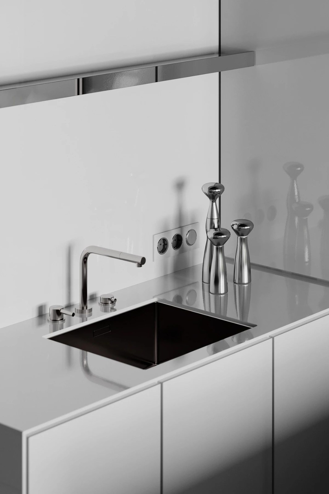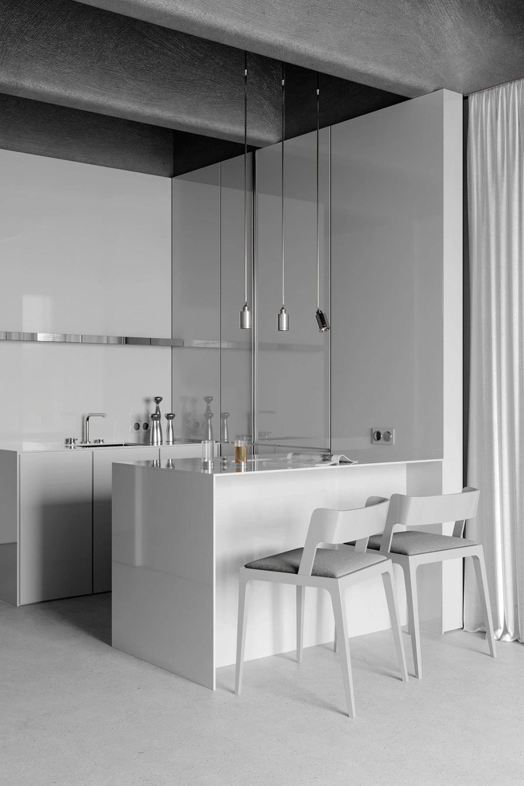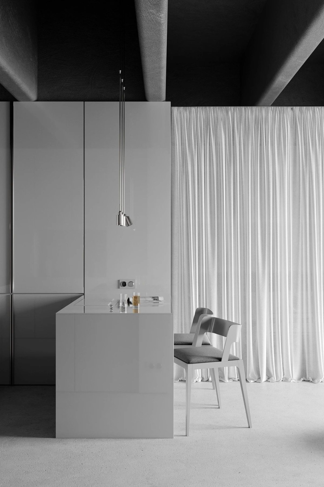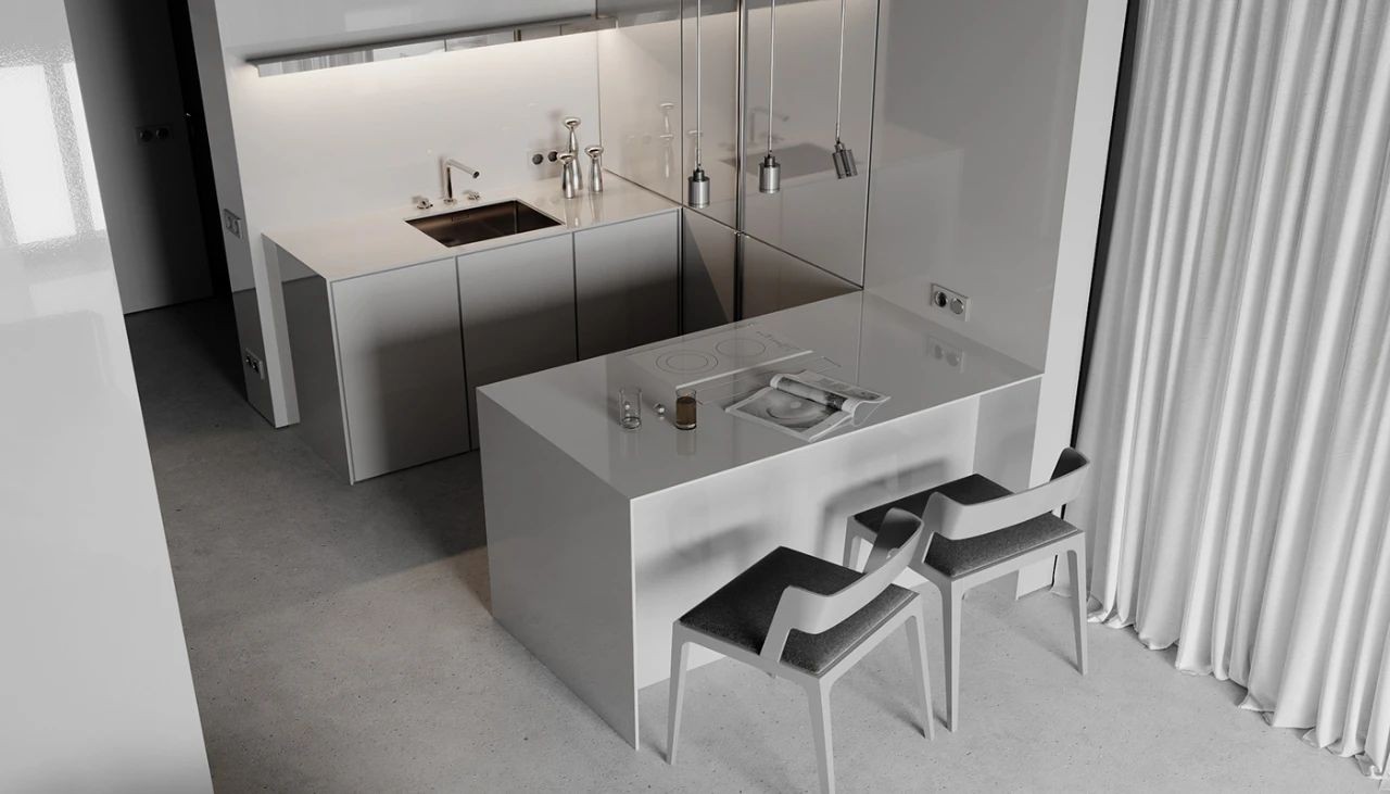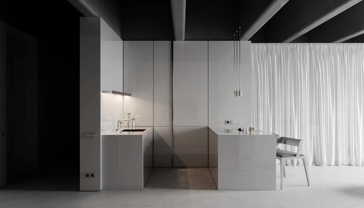 離入口近的是廚房和餐廳,櫥柜、臺(tái)面,防濺板,都選用了與墻面統(tǒng)一的飾面,讓空間保持了一致,更顯簡(jiǎn)潔干練。