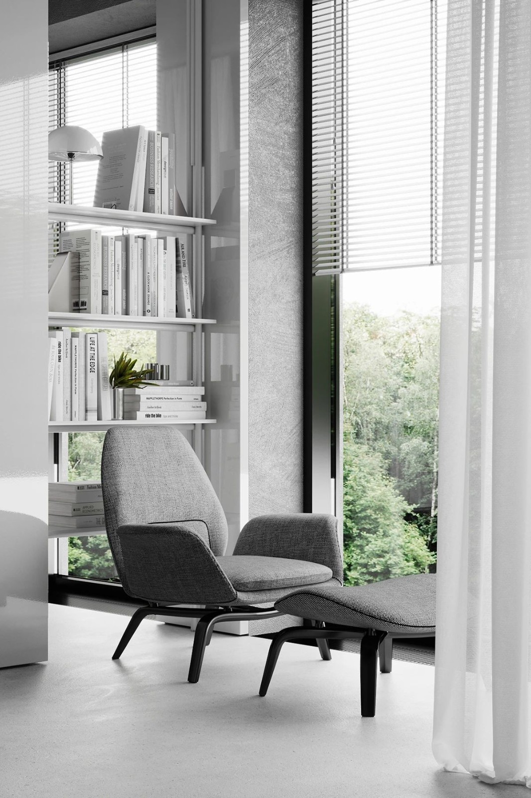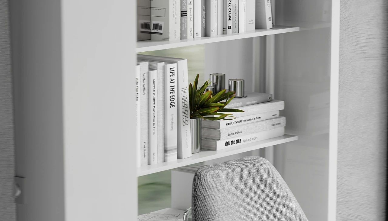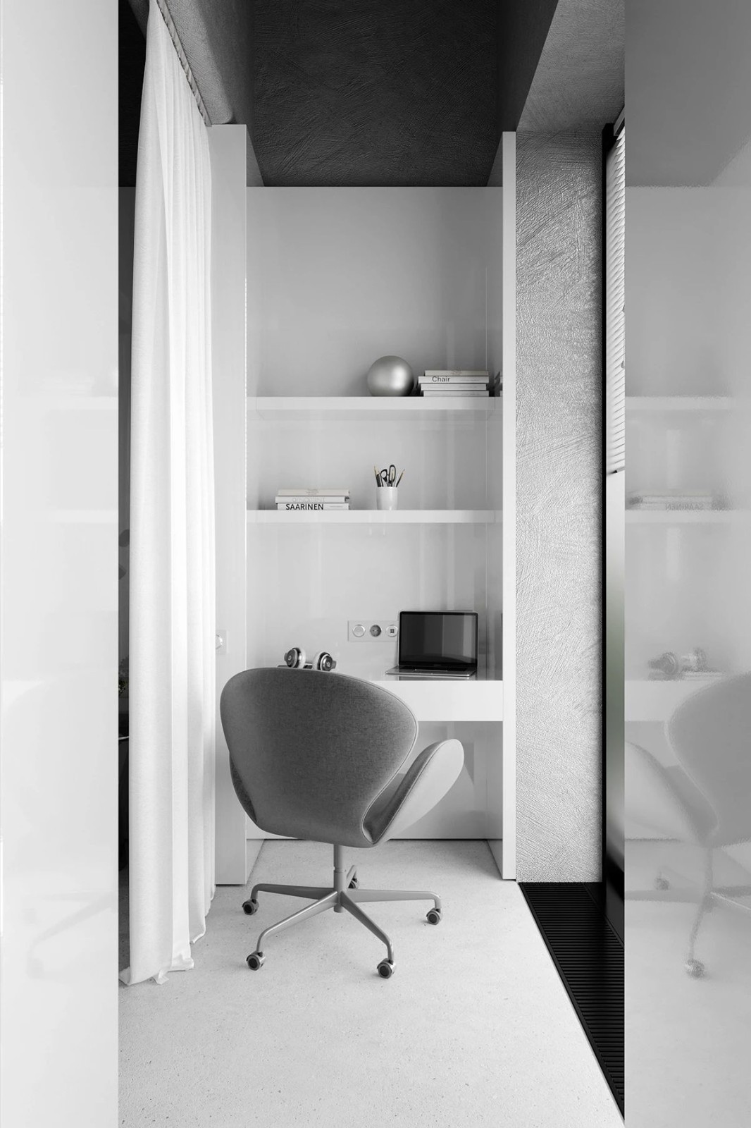 一把辦公椅和置物架,整個(gè)設(shè)計(jì)簡(jiǎn)單且舒適,讓人特別有安全感。