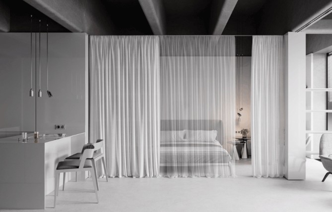 這個(gè)小的辦公區(qū)是特意為屋主設(shè)計(jì)的,利用簾子做門,內(nèi)部只有辦公桌、一把辦公椅和置物架,整個(gè)設(shè)計(jì)簡(jiǎn)單且舒適,讓人特別有安全感。