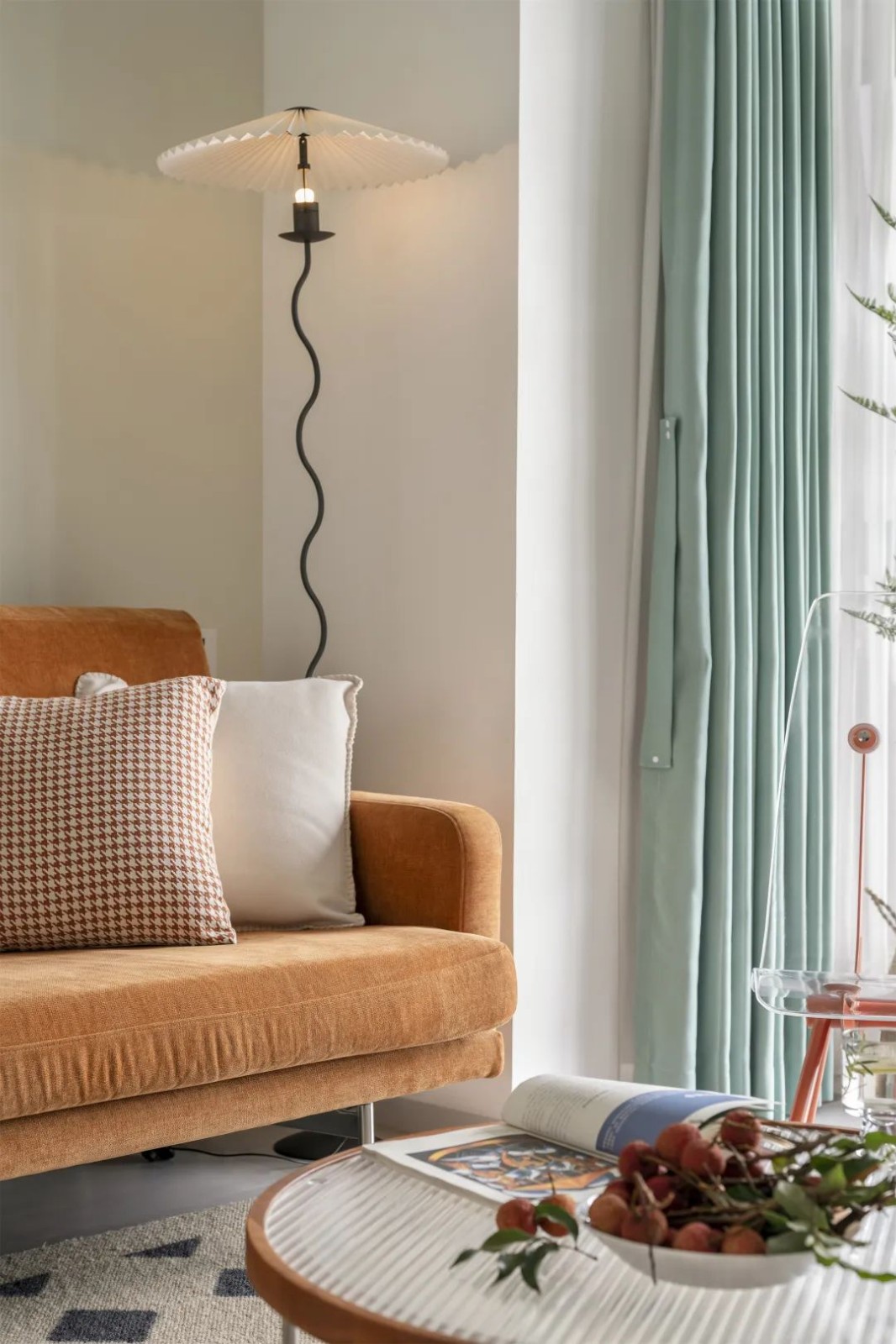 根據(jù)屋主喜歡硬沙發(fā)的習慣, 選擇了有筋骨的沙發(fā), 沙發(fā)旁邊的空隙放不下一張邊幾, 于是選擇了身量纖纖的落地燈。 黑色曲線與百褶燈罩的搭配, 點綴暖調(diào)背景墻,有種亭亭玉立的曼妙。