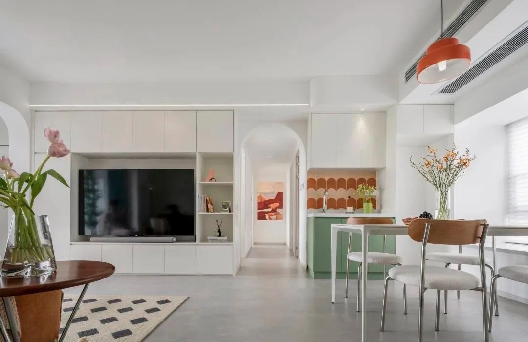 對于本身不大的空間,淺色系是, 這里大面積采用白色、淺黃色打底, 搭配低飽和度的莫蘭迪色系, 再小面積穿插藍色、橘色為點綴。 地面鋪貼柔光的淺水泥灰瓷磚, 猶如畫布一般,自身幾乎沒有存在感, 呈現(xiàn)出一種清爽碰撞溫馨的柔美氛圍。
